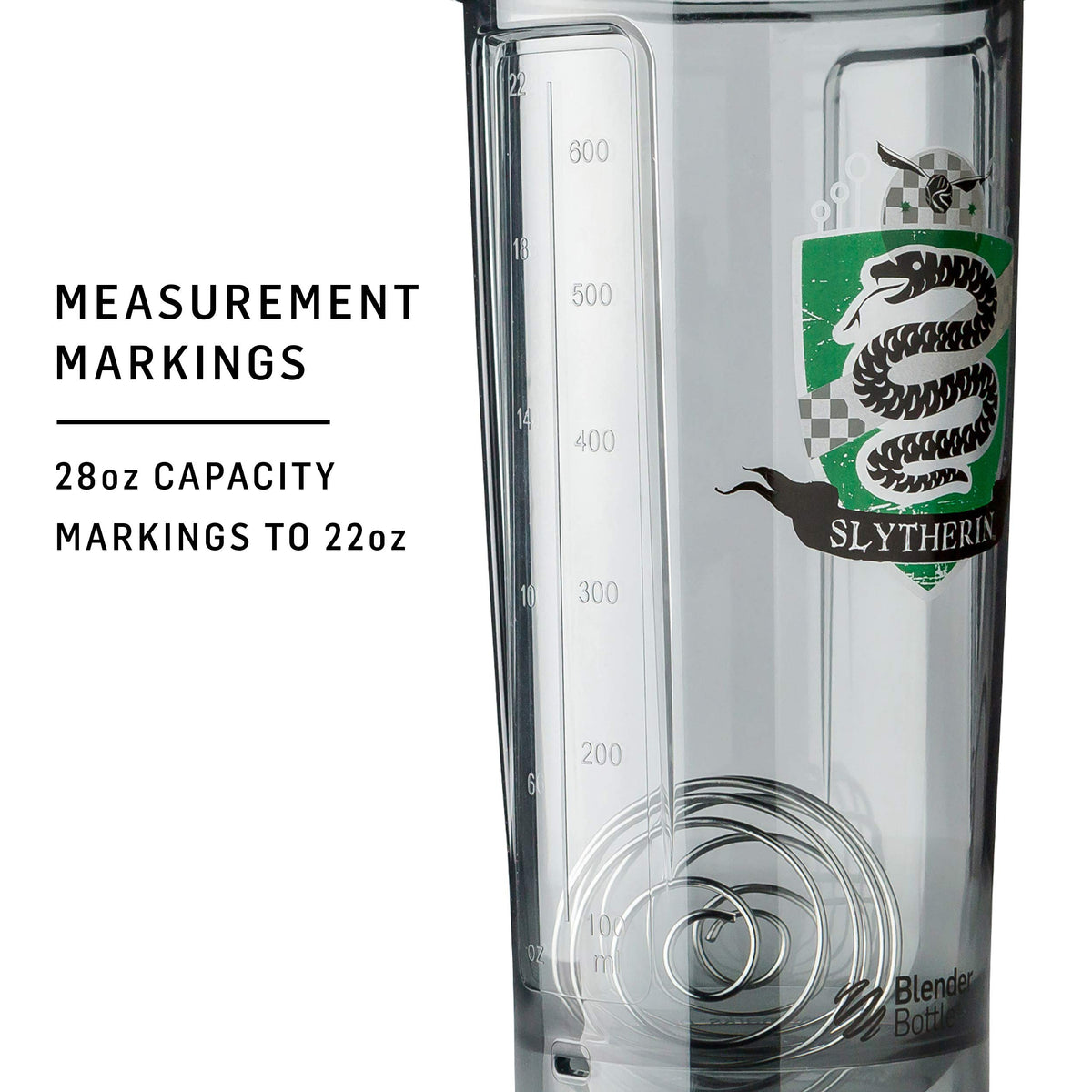 - Q: What is the capacity of the BlenderBottle Harry Potter Shaker Bottle? A: The BlenderBottle Harry Potter Shaker Bottle has a capacity of 28 ounces, though the measurements on the bottle only go up to 20 ounces.