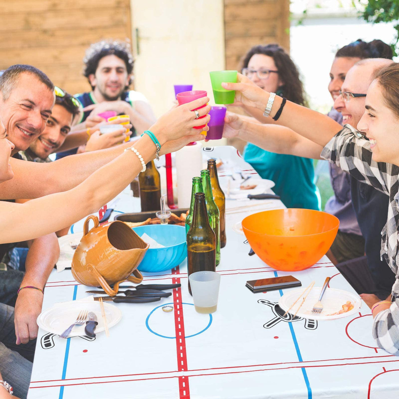- Q: What design elements do the tablecloths feature? A: The tablecloths feature fun and creative ice hockey elements that add a festive atmosphere.