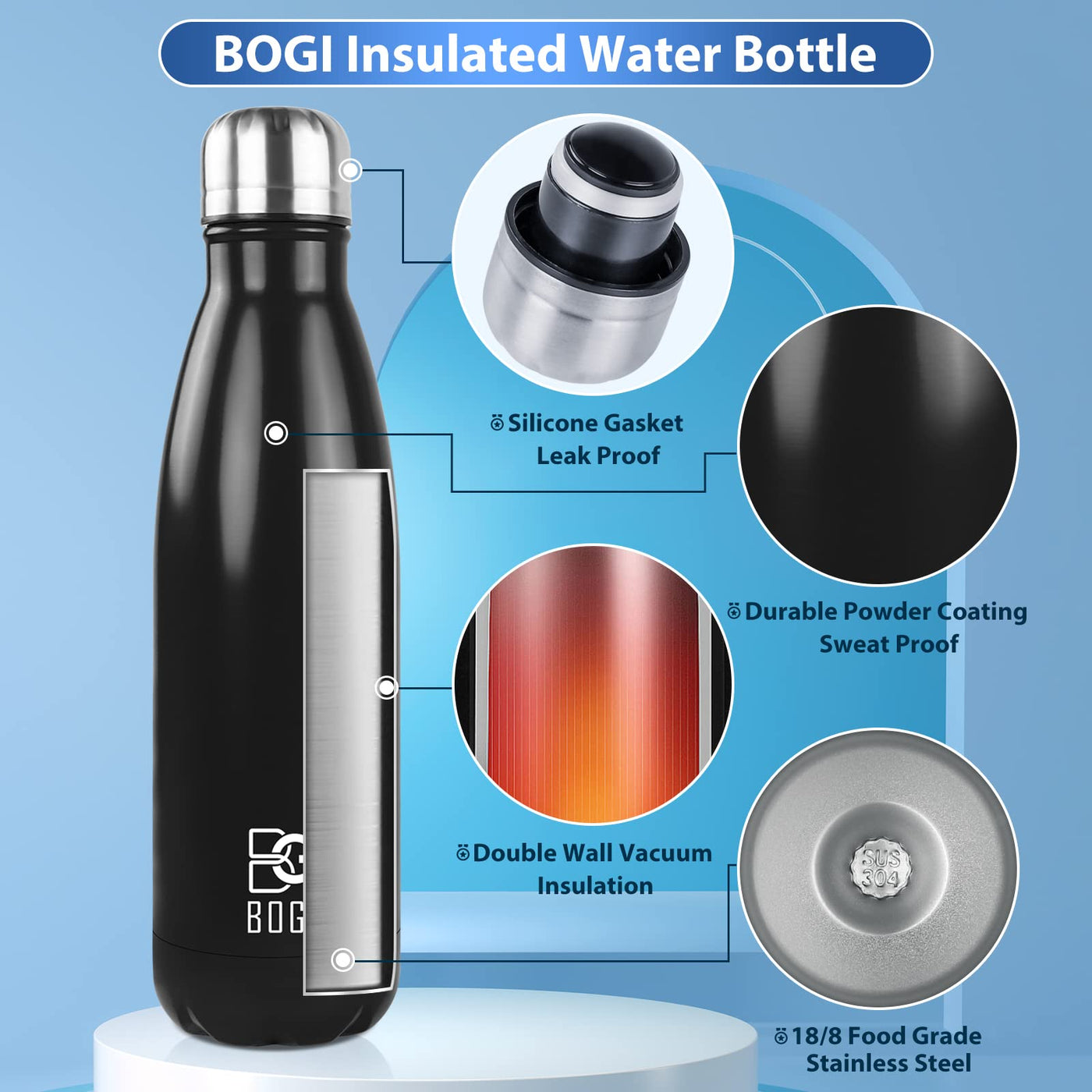 BOGI Insulated Water Bottle 17oz Stainless Steel Water Bottles Leak Proof Sports Metal Water Bottles Keep Drink Cold for 24 Hours and Hot for 12 Hours BPA Free kids water bottle for School (Black)