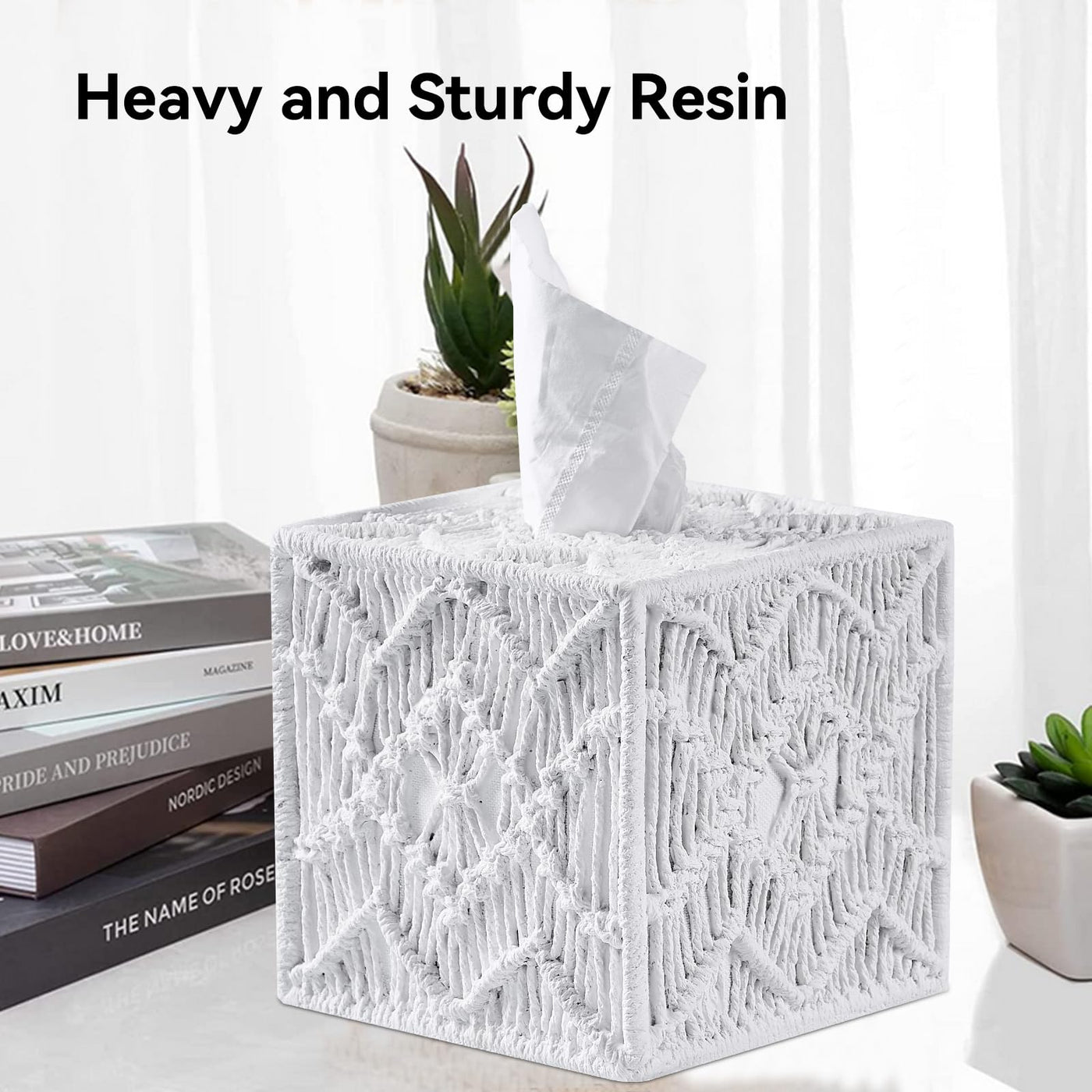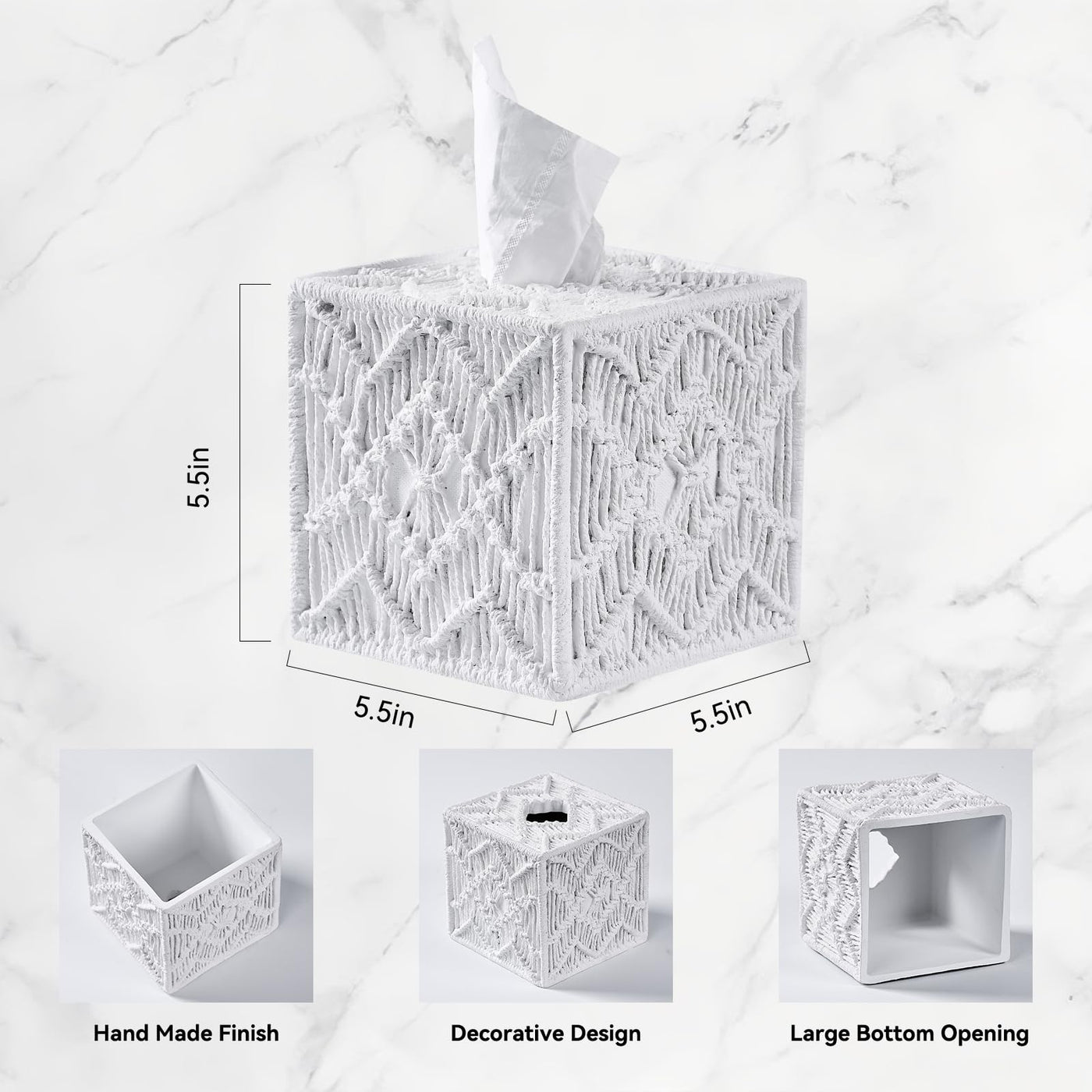 - Q: What material is the White Woven Macrame Boho Tissue Box Cover made from? A: The tissue box cover is made from durable eco-friendly resin, ensuring it is heavy and sturdy for long-lasting use.