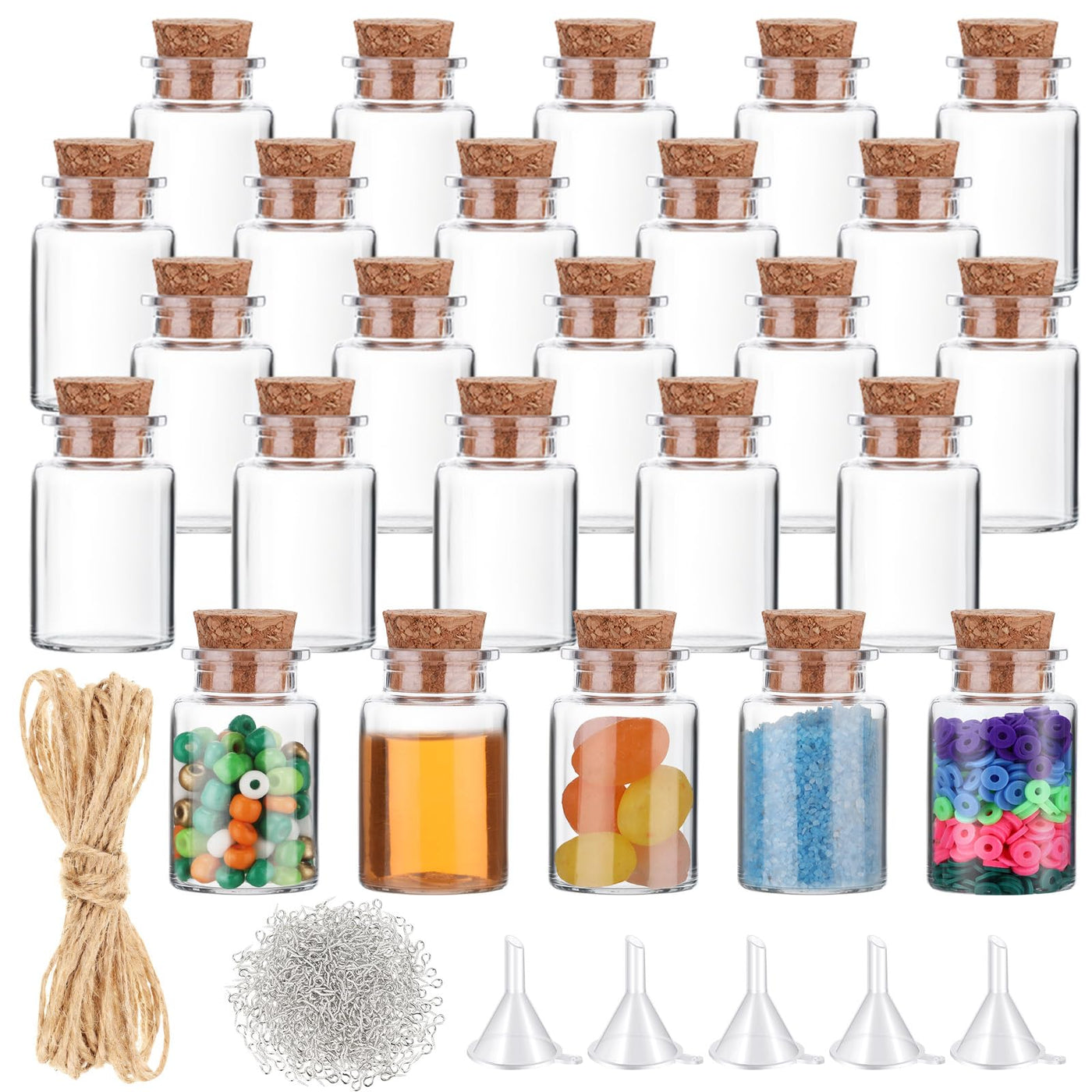 Bokon 25 Pack Mini Plastic Bottles with Corks Stoppers Eye Screws Funnels Small Potion Bottles Tiny Clear Sand Art Jar Wishing V