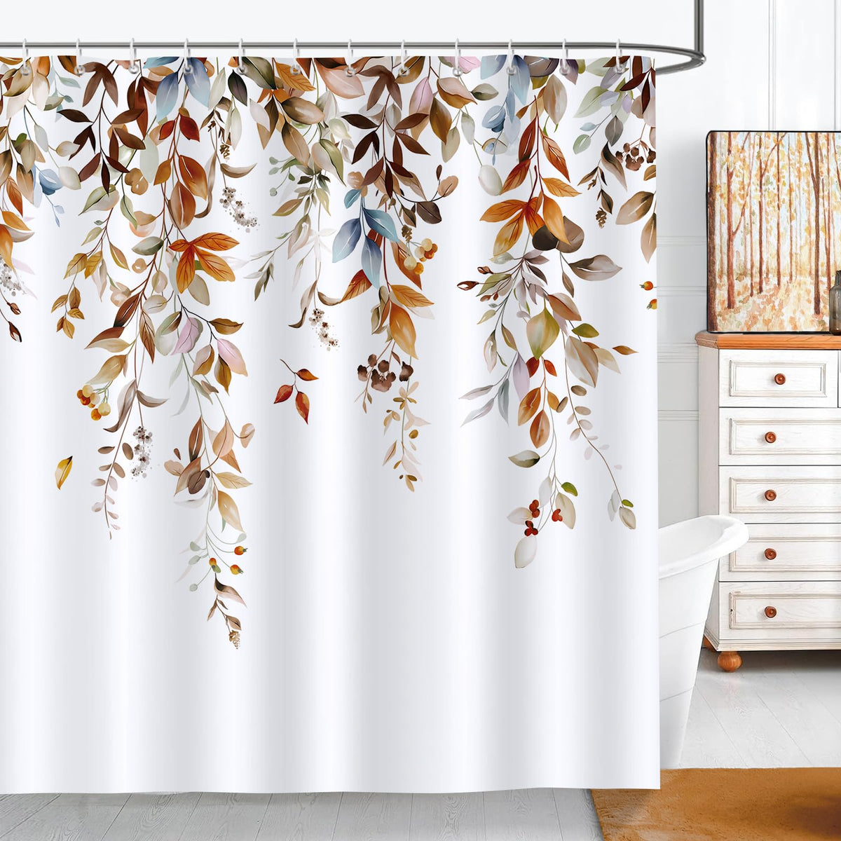 - Q: What design does the shower curtain feature? A: The Bonhause Brown Eucalyptus Shower Curtain features an autumn leaves pattern that creates a natural atmosphere and adds vibrancy to your bathroom.