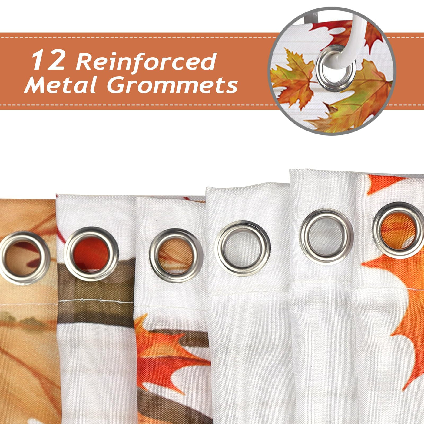 - Q: What design features does the shower curtain have? A: The shower curtain features a charming design with cute gnomes, pumpkins, maple leaves, and sunflowers, perfect for adding a festive autumn touch to your bathroom.