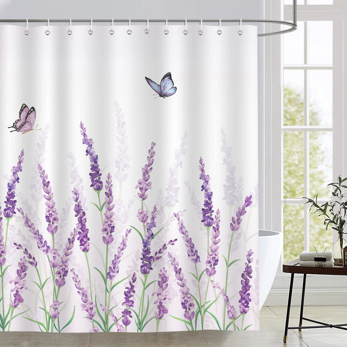 • Q: What is the design of the shower curtain? A: The shower curtain features a beautiful lavender floral and butterfly design in a charming purple tone, enhancing the ambiance of any bathroom.