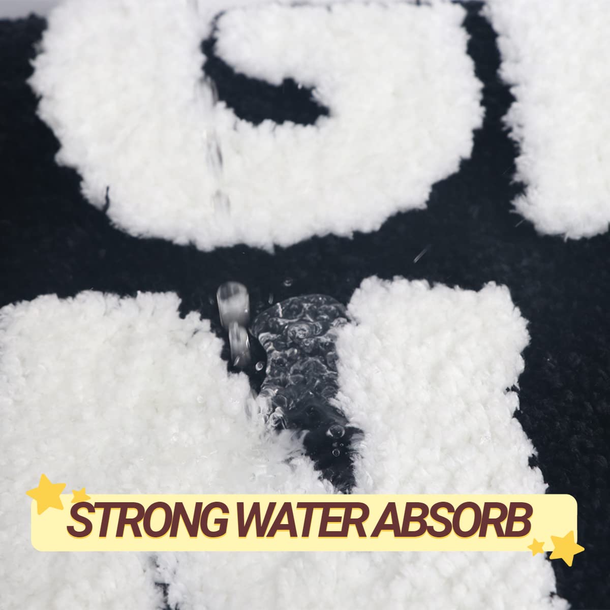 - Q: What is the design of the BOVEU Bath Mat? A: The bath mat features a playful design with tufted white letters spelling out 'Nice', adding a fun touch to your bathroom decor.