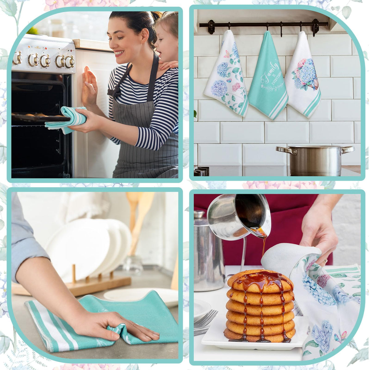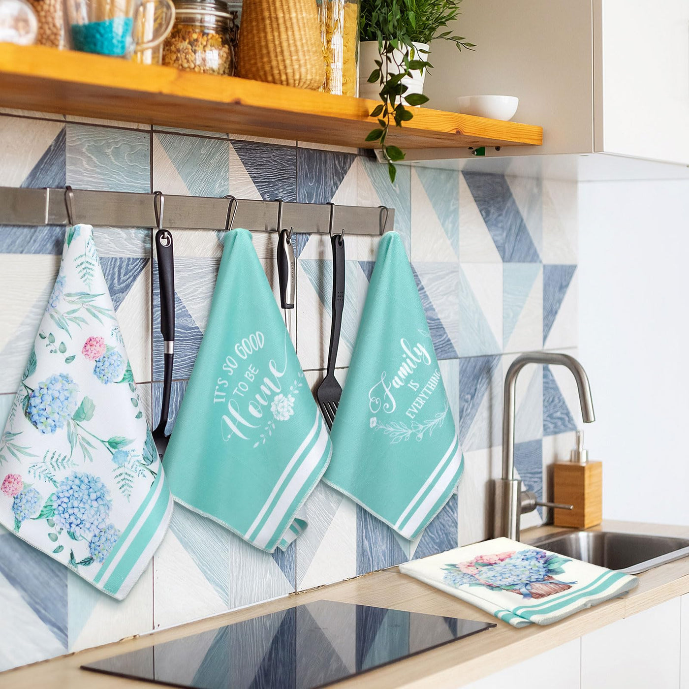 - Q: How many towels are included in the set? A: The set includes a total of 6 different styles of hydrangea-themed kitchen towels.