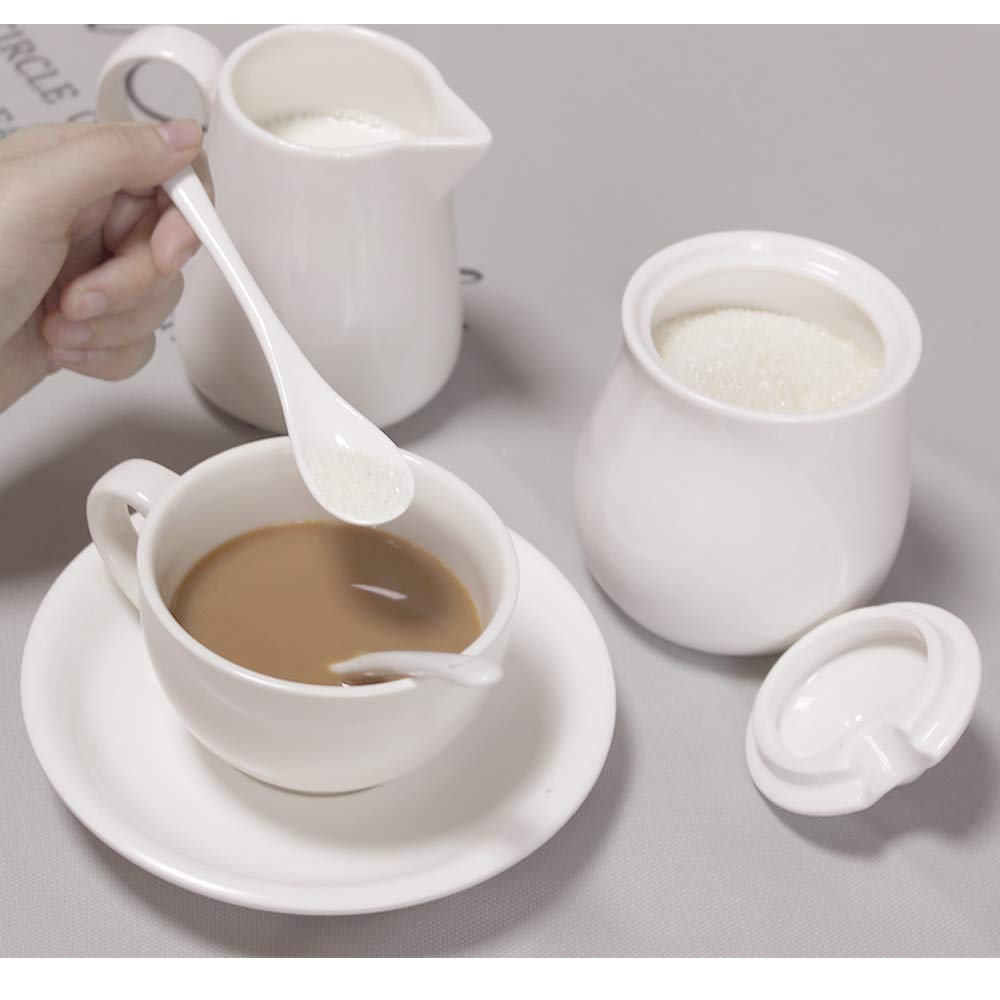 • Q: What does the package include? A: The package includes one cream jug, one sugar bowl with a lid, and one matching ceramic sugar spoon.