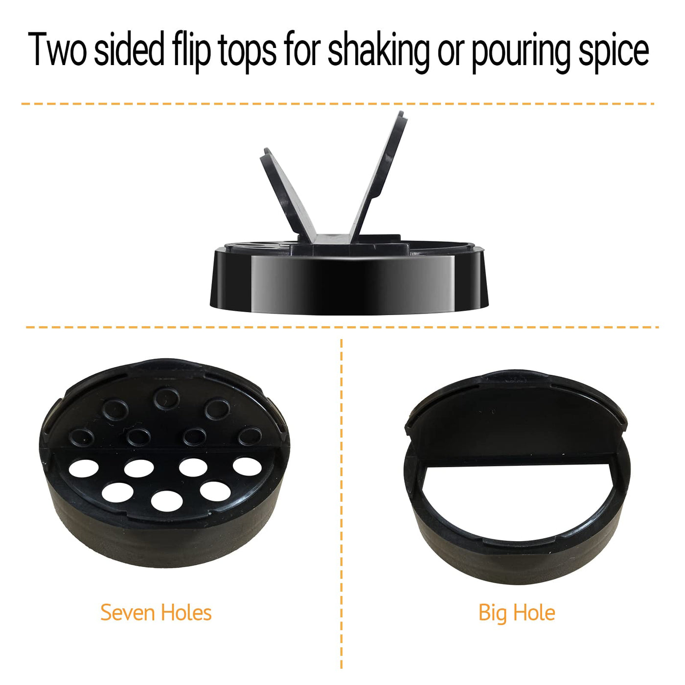 - Q: What type of lids do the spice jars have? A: The spice jars feature two side flip top lids: one with holes for shaking and another for pouring or using a measuring spoon.