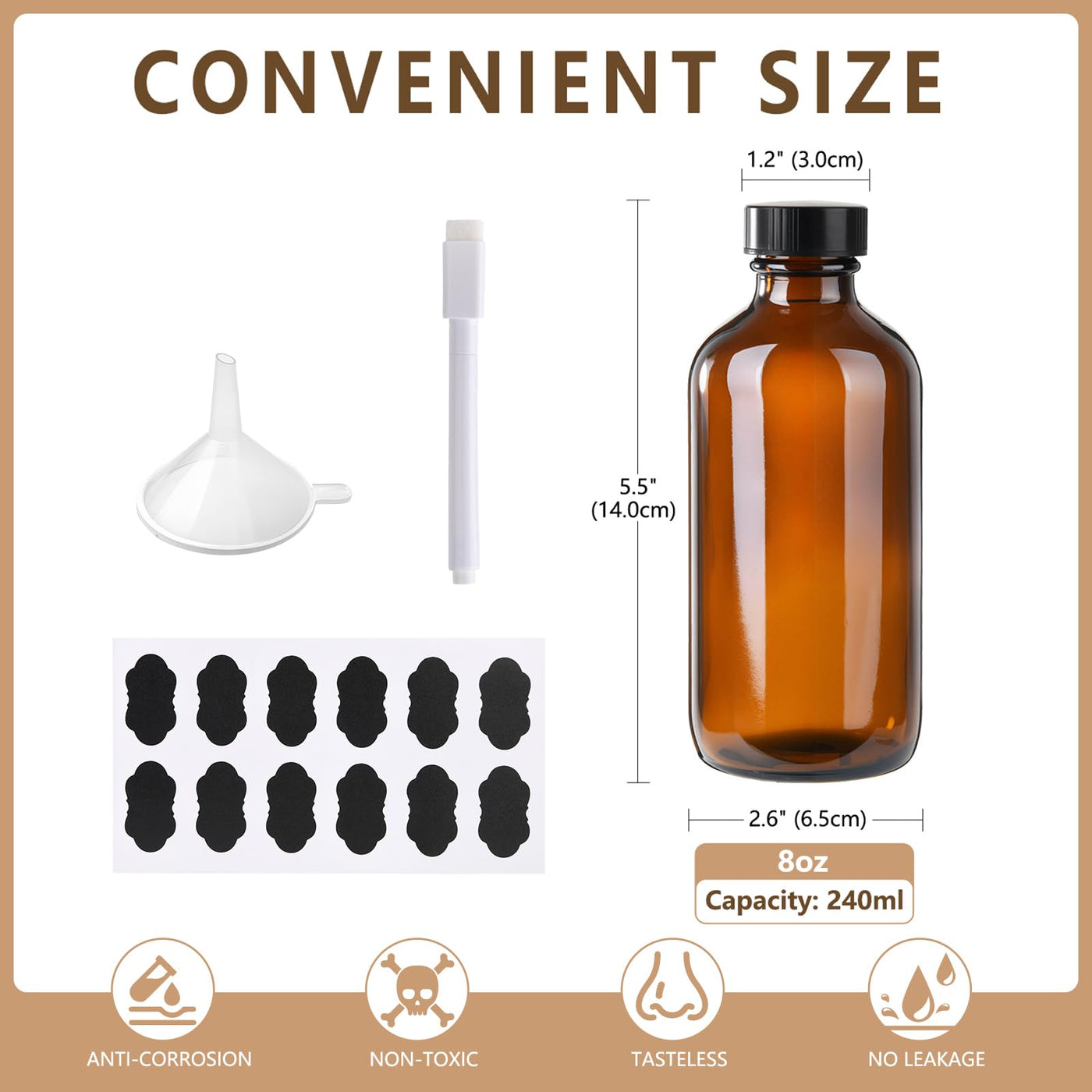 BPFY 12 Pack 8 oz Glass Boston Bottle With Black Poly Cap Funnel Chalk Labels Pen Dispensing Bottles for Homemade Vanilla Extract Essential Oils Herbal Medicine Wedding Christmas Decor (Amber)