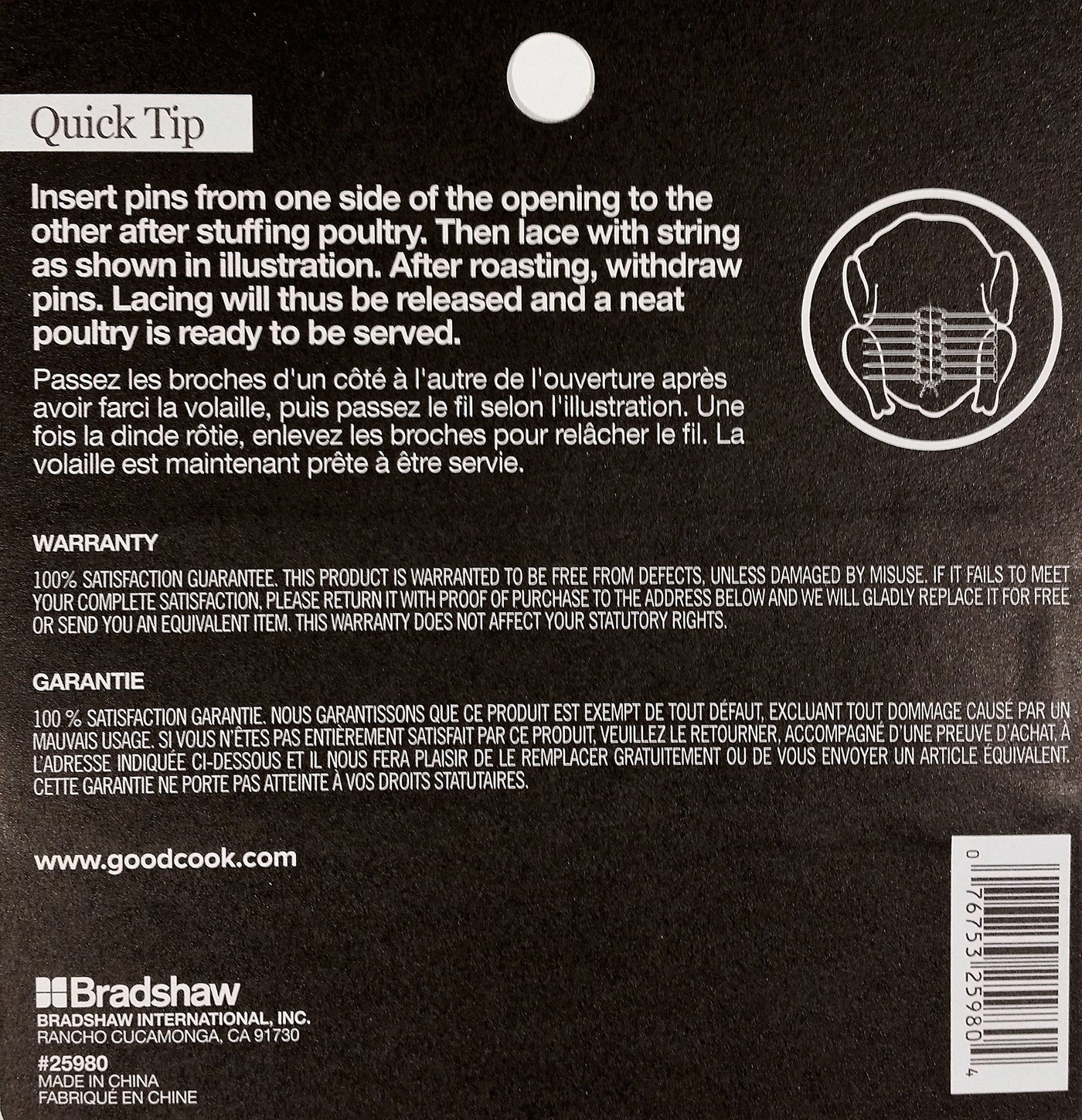 • Q: What is the Bradshaw International 25980 Stainless Steel Turkey Lacer used for? A: The turkey lacer is designed to keep bacon tightly wound on bacon-wrapped fillets, maintain the integrity of roasts while baking, and securely lace stuffed turkeys for even cooking.