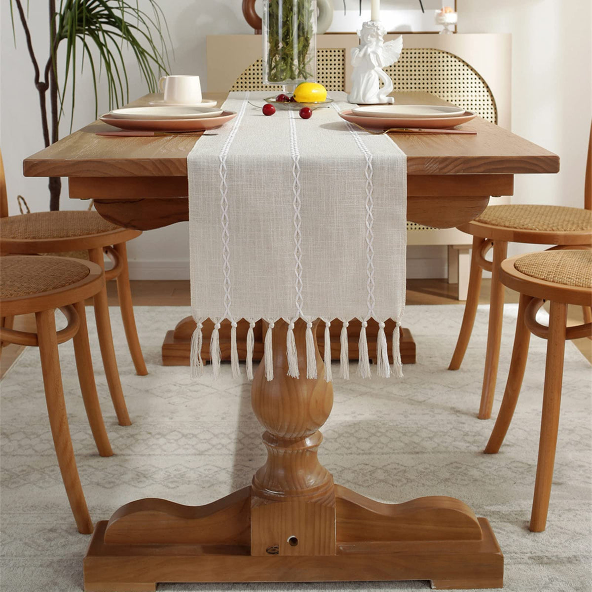 - Q: Does the table runner have any decorative features? A: Yes, it features delicate stripes and beautiful tassels that enhance its aesthetic appeal.