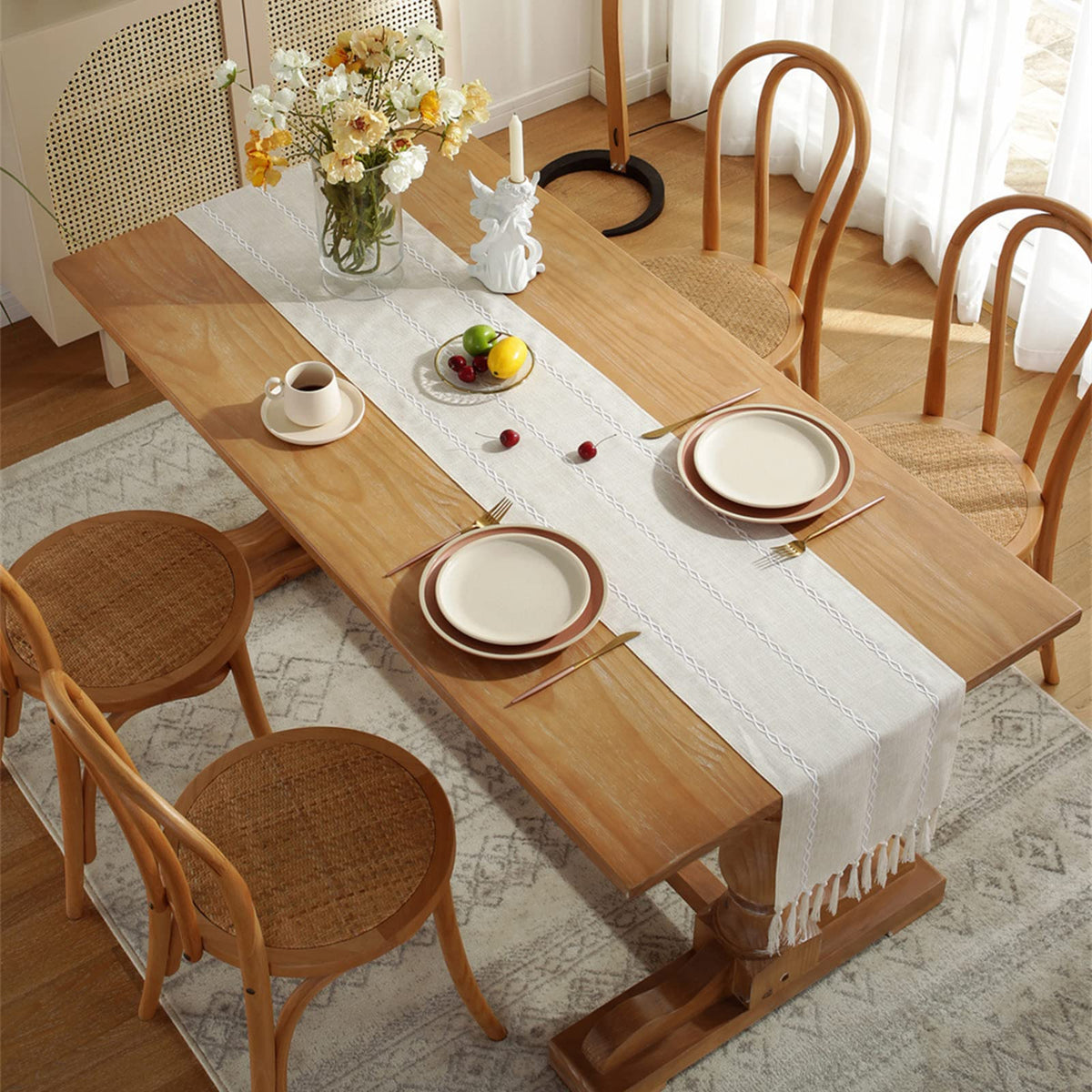 - Q: What is the design style of the table runner? A: The table runner has an exquisite rustic style with a unique solid color pattern and tassels, creating a relaxed atmosphere.