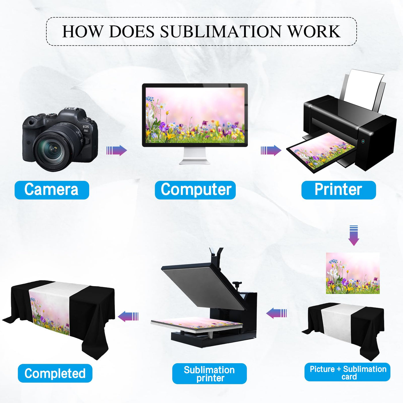 • Q: What equipment do I need to sublimate designs onto the table runners? A: To sublimate designs onto these table runners, you will need a thermal sublimation printer, thermal sublimation ink, and a hot press.