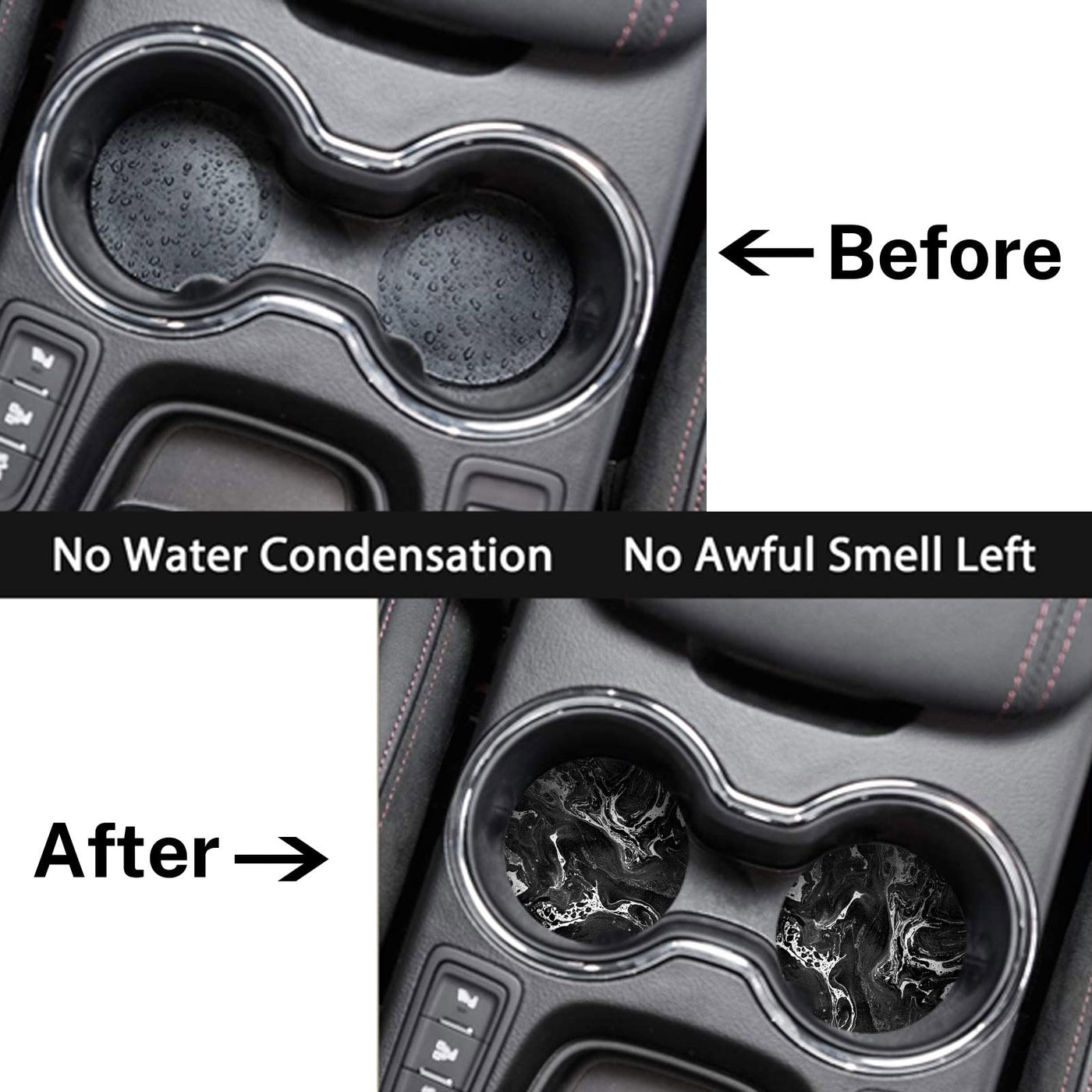 - Q: Do these coasters have any special features? A: Yes, the coasters feature crescent finger grooves for easy removal and a stylish black marble design that adds aesthetic appeal to your vehicle.