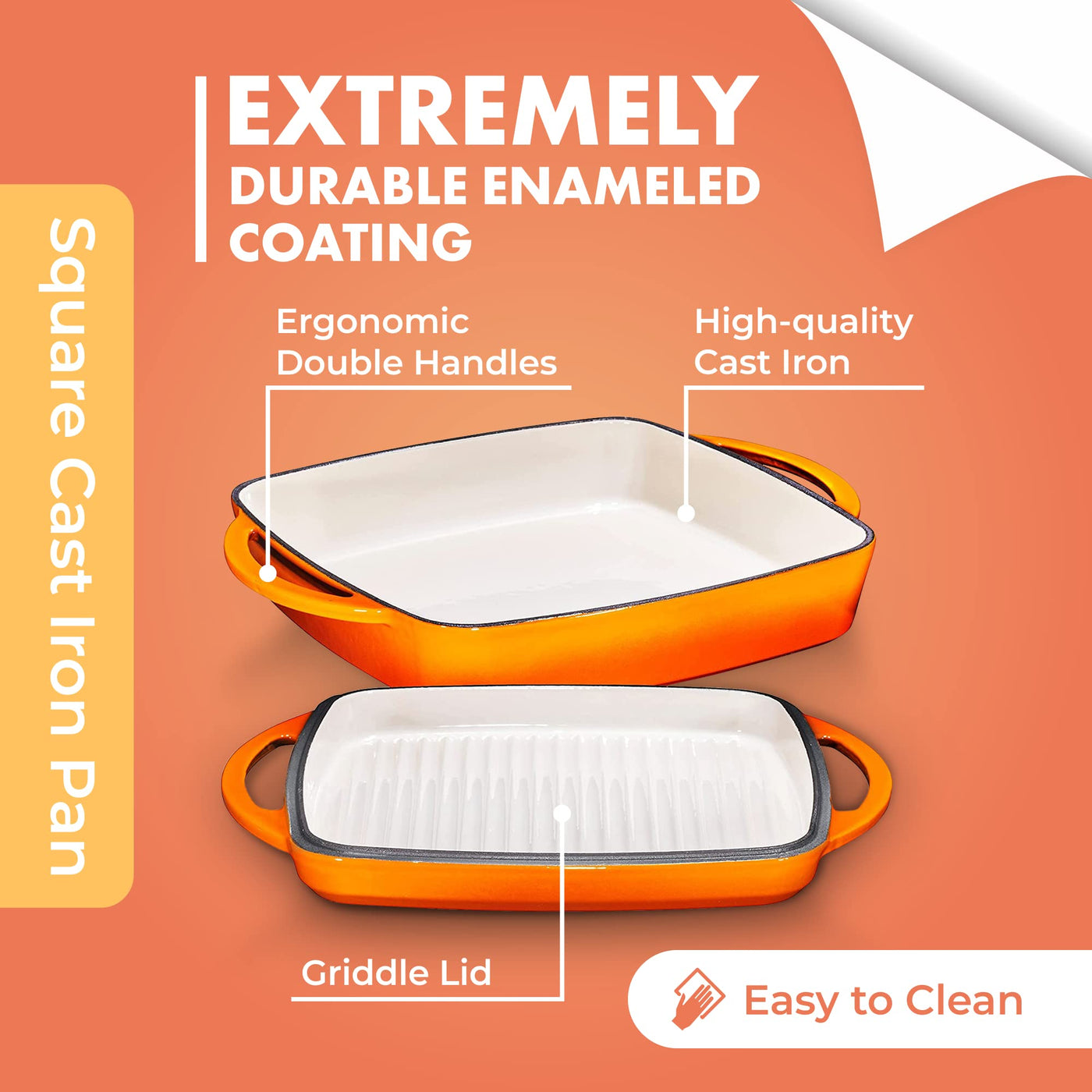 Bruntmor 2-in-1 Pre-seasoned Square Cast Iron Dutch Oven With Dual Handles Non stick Pan with Grill All-in-One Cookware Set Cast Iron Casserole Dish with Lid for Braising Dishes Pumpkin Spice