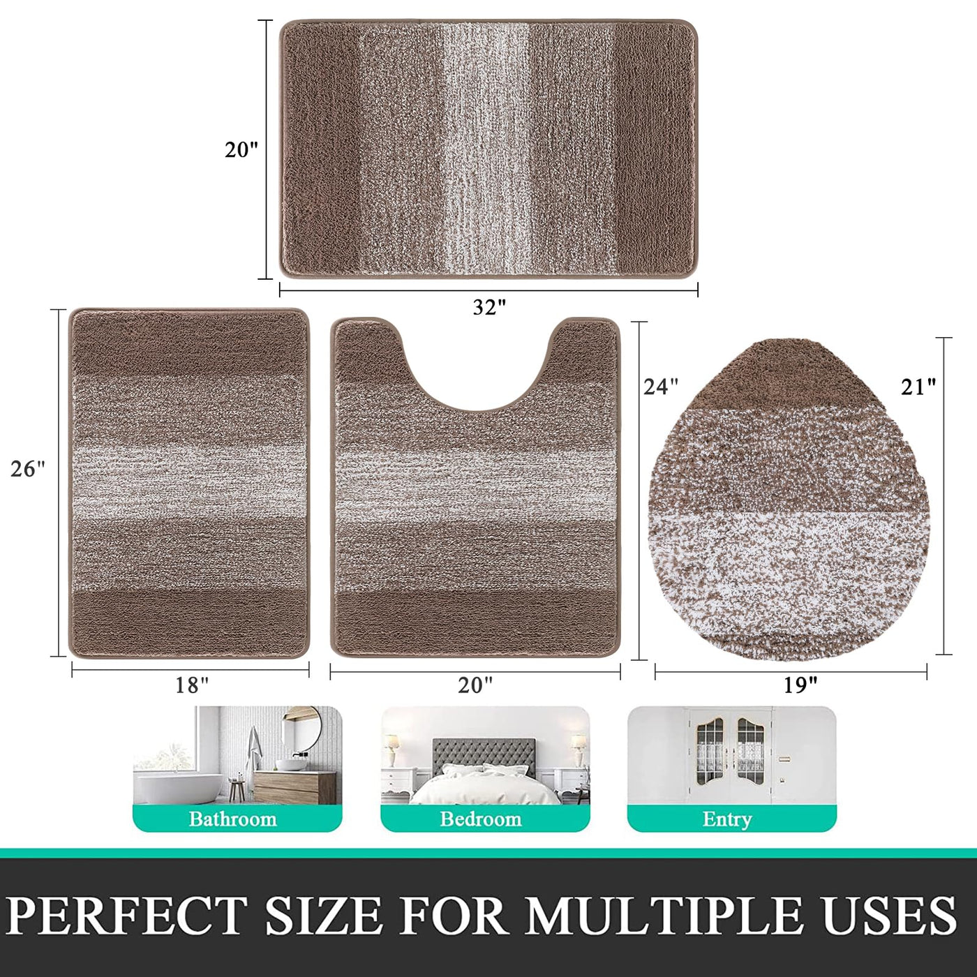 - Q: What size is included in the 4-piece set? A: The 4-piece set includes rugs of various sizes, including a U-shaped contour mat for the toilet, a lid cover, and additional mats for other bathroom areas.