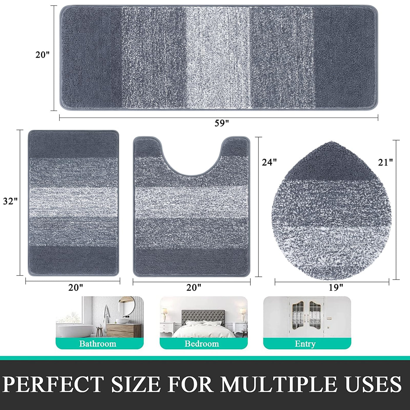 - Q: What sizes are included in the 4-piece set? A: The 4-piece set includes a U-shaped toilet rug, a toilet lid cover, and two rectangular bath rugs, designed to fit various bathroom layouts.