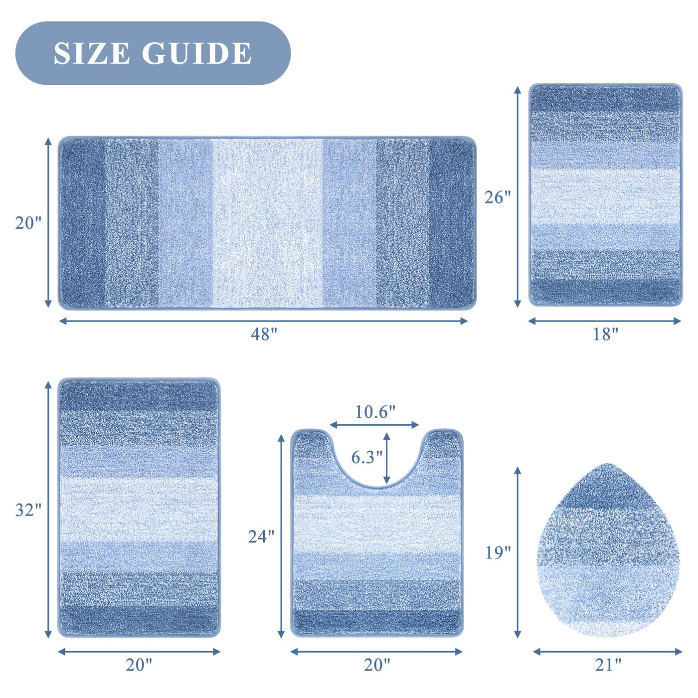 - Q: What is the size of the Bsmathom bathroom rug set? A: The Bsmathom bathroom rug set includes five pieces, including a toilet lid cover and various rug sizes to suit your bathroom layout.