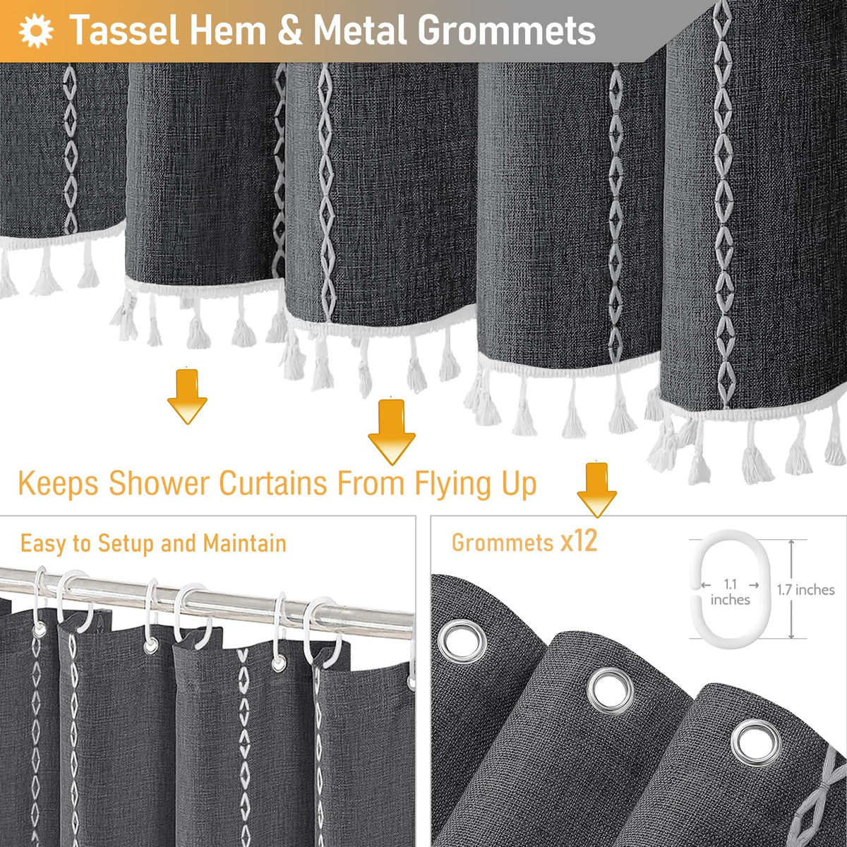 - Q: What style does this shower curtain feature? A: The BTTN shower curtain features a Boho farmhouse style with a unique 3D embroidery stripe design and tassels on three sides, adding an elegant touch to your bathroom.