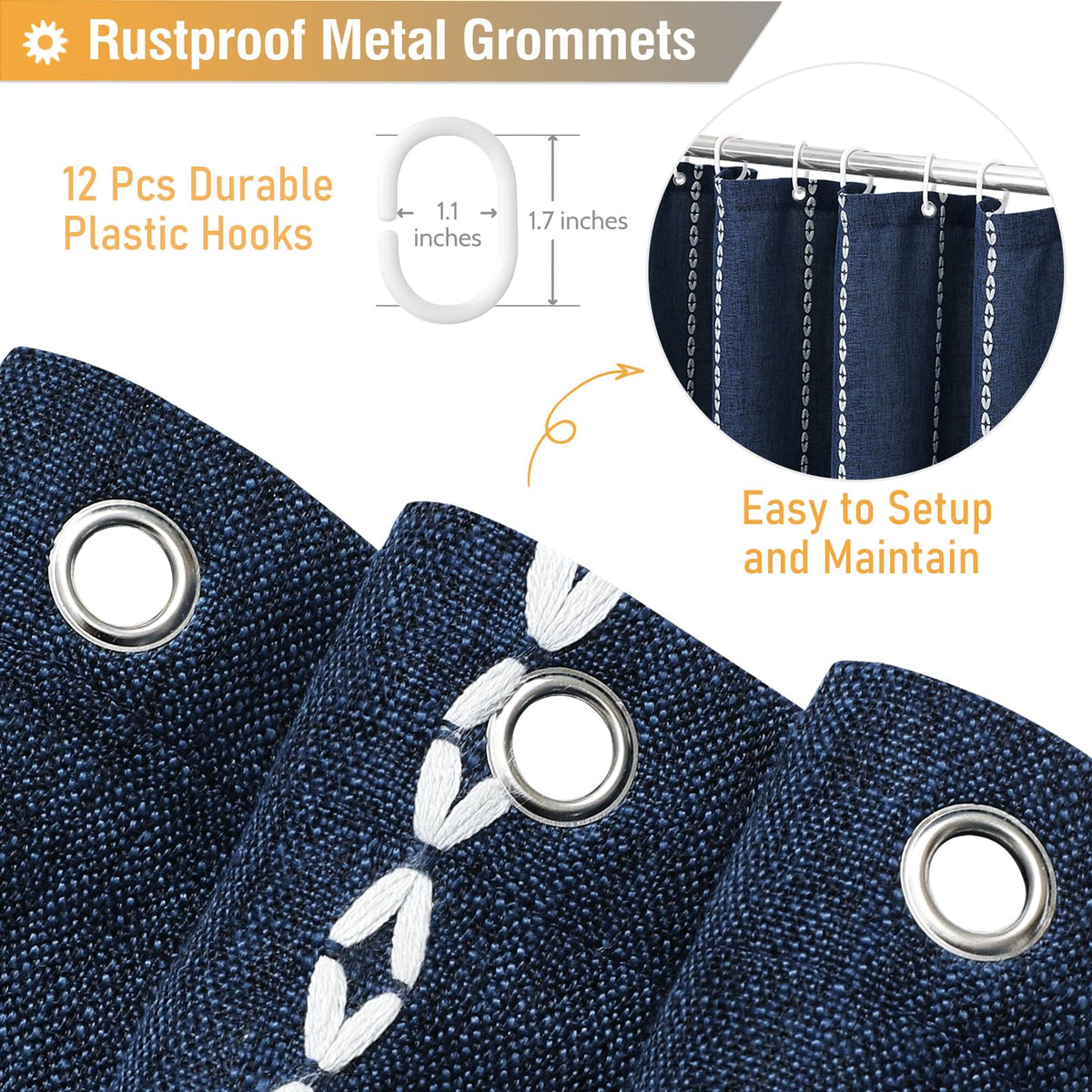 - Q: What style does the shower curtain feature? A: The shower curtain showcases a unique combination of bohemian and farmhouse styles, featuring a 3D embroidery stripe design and decorative tassels on three sides.