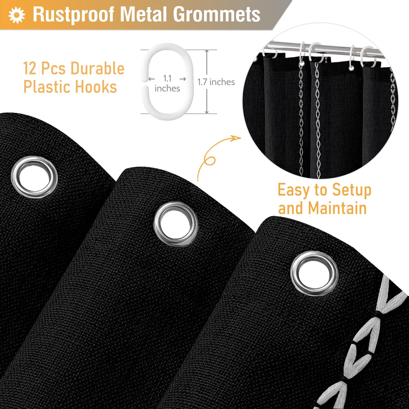 - Q: Does the shower curtain come with hooks? A: Yes, the package includes 12 plastic hooks for easy installation of the shower curtain.