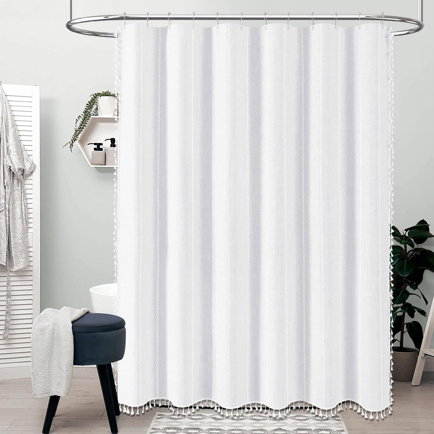 Bttn White Farmhouse Shower Curtain, Boho Linen Striped Heavy Duty Fabric Shower Curtain Set With Tassel, Bohemian Country Ultra
