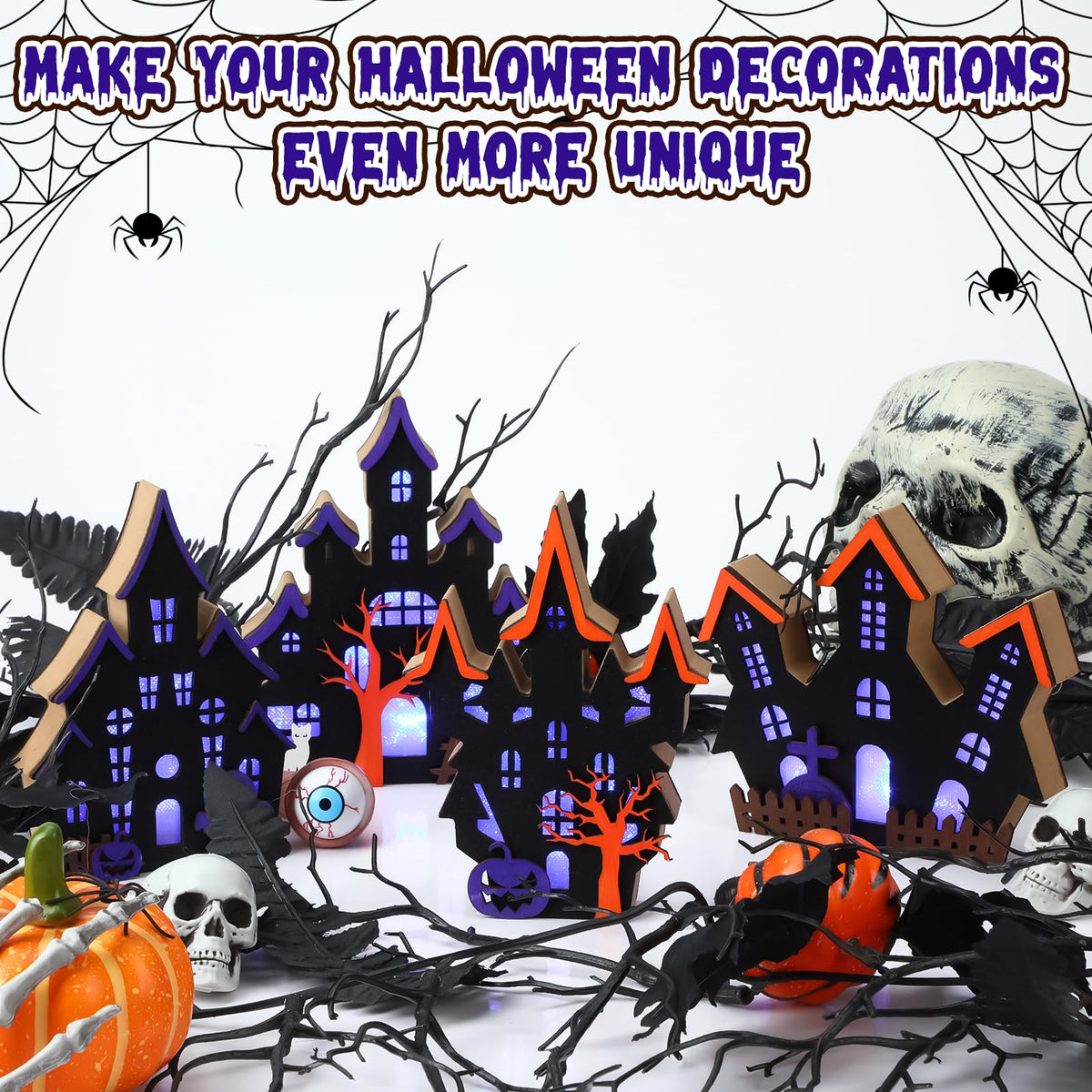 Bucherry 4 Pack Halloween Table Haunted House Decor Lighted Wooden Village Ghost House 3D Tabletop Decorations for Halloween Ind
