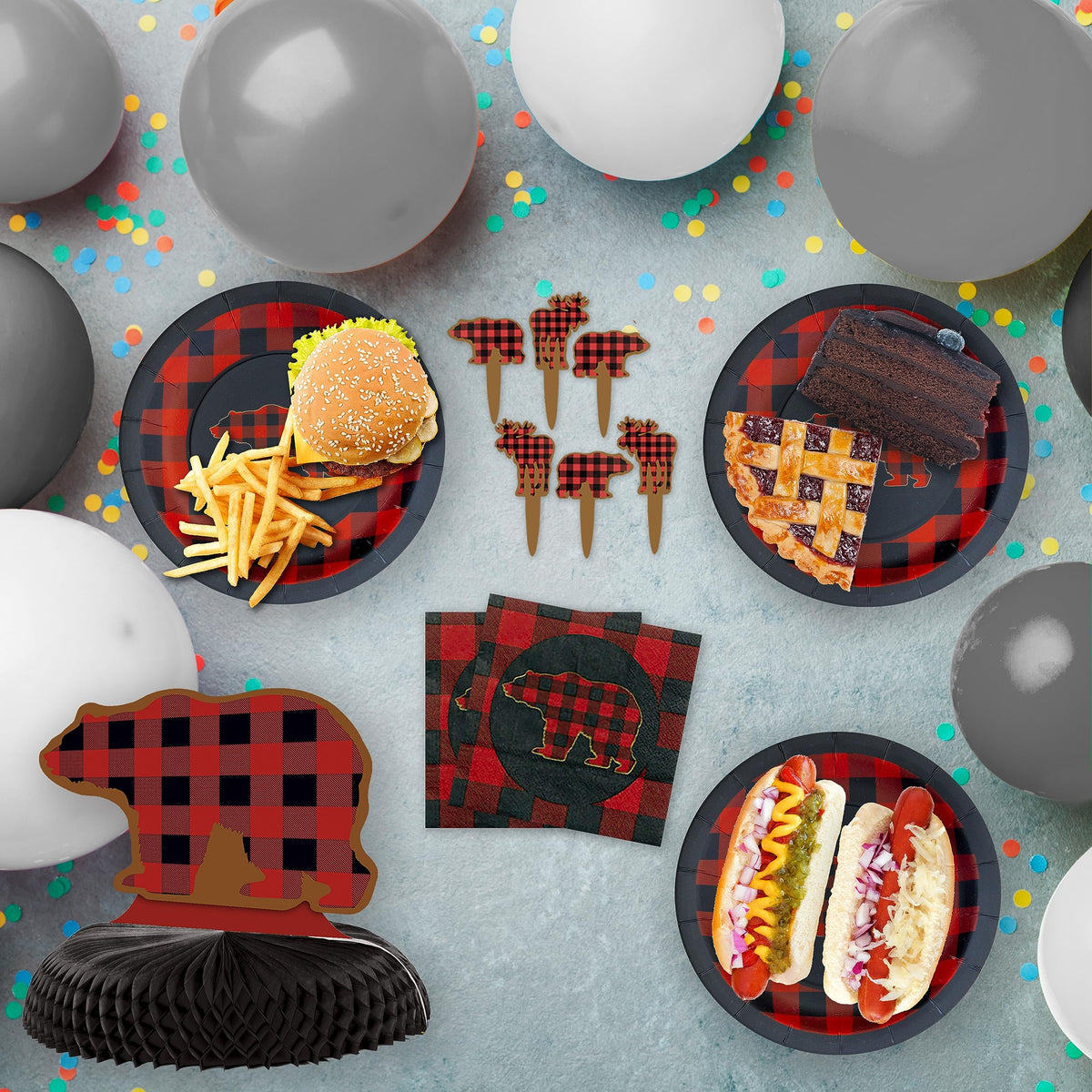 - Q: What additional decorations are included in the set? A: The set comes with a bear centerpiece and 24 party picks featuring the plaid bear and moose design, enhancing your party's rustic theme.