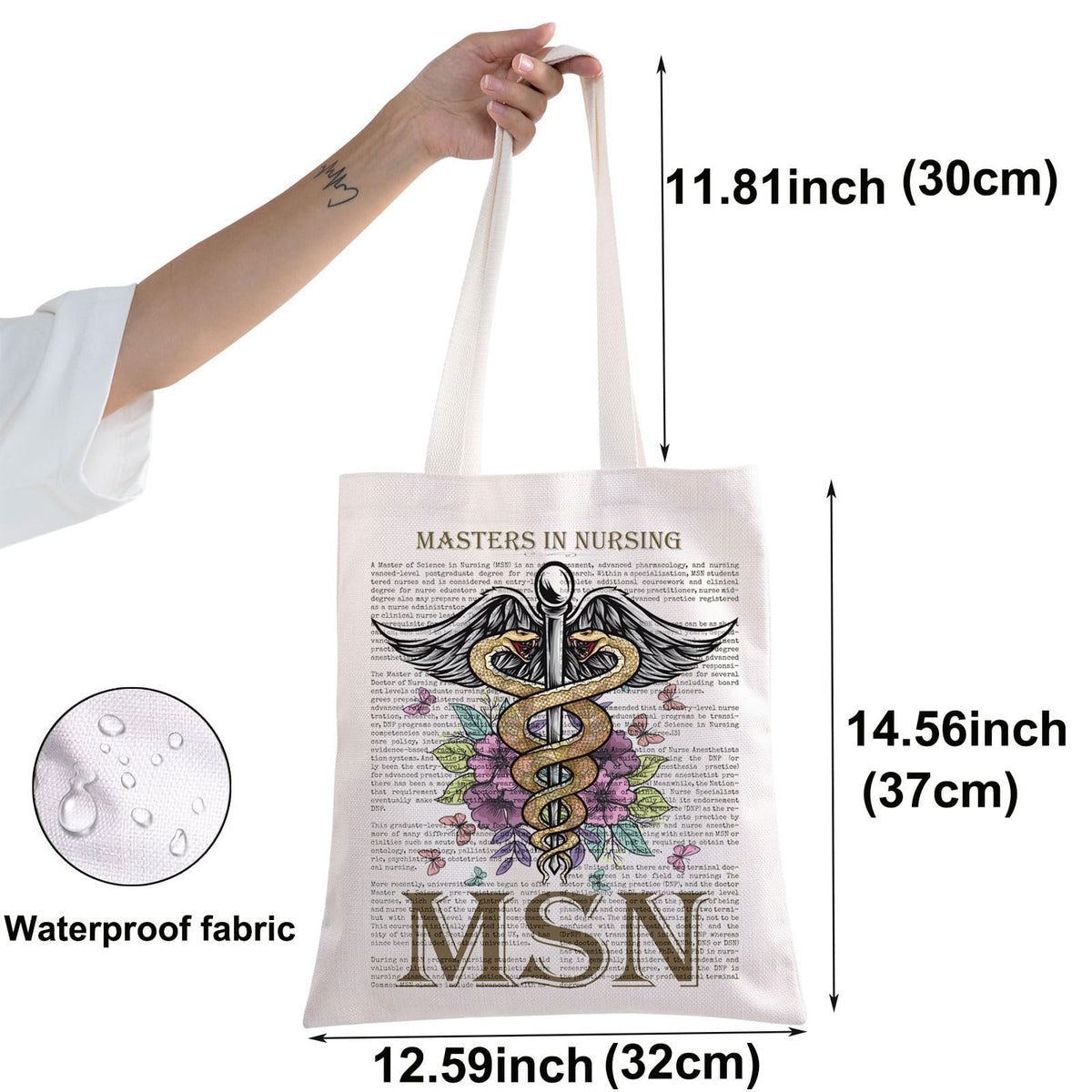 - Q: What are the dimensions of the BWWKTOP Masters In Nursing Tote Bag? A: The dimensions of the tote bag are 14.56 inches in width and 12.59 inches in height.