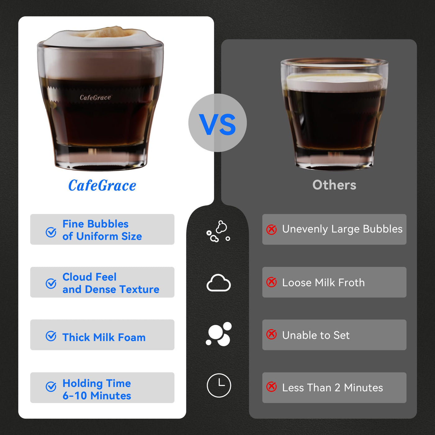 - Q: What types of milk froth can the CafeGrace Milk Frother make? A: The CafeGrace Milk Frother can create airy froth milk, dense froth milk, hot milk, cold froth milk, and chocolate milk.