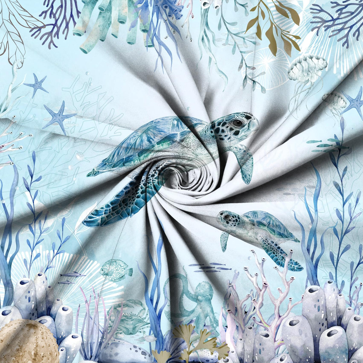 Caheansi Sea Turtle Shower Curtain, Teal Blue Ocean Beach Coastal Turtle Starfish Jellyfish Underwater Creatures Bathroom Curtai