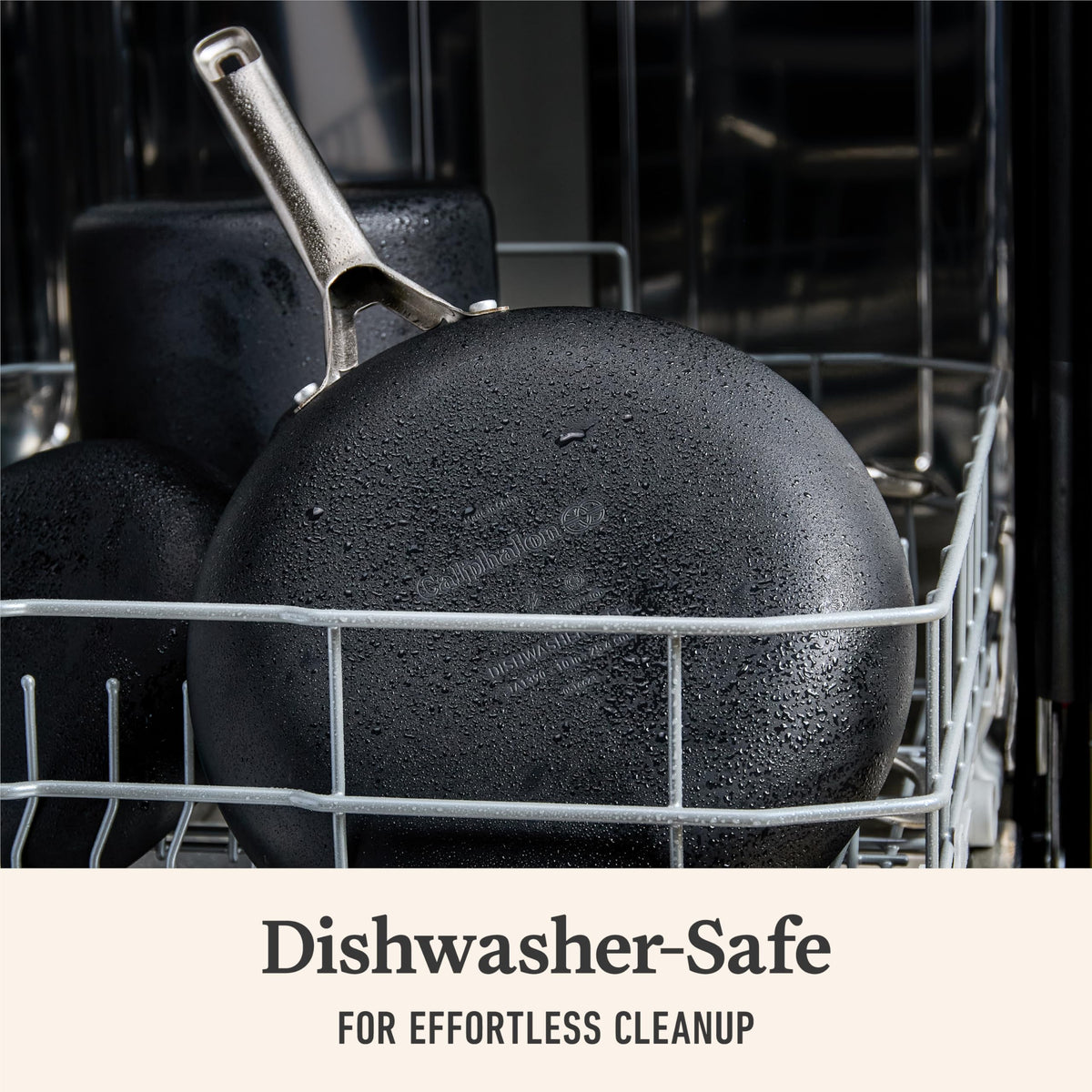 • Q: What is included in the Calphalon® Hard-Anodized Nonstick 10-Piece Cookware Set? A: The set includes a 5-quart sauté pan with a tempered glass lid, along with various other essential cookware pieces designed for versatility in cooking.