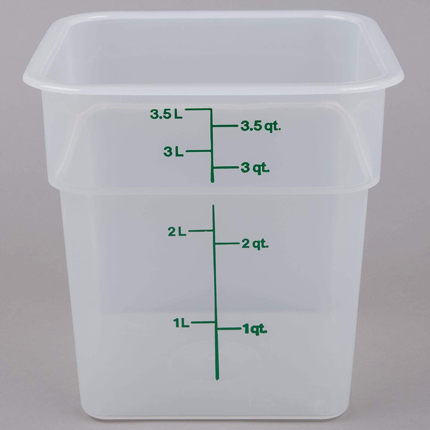 • Q: What is the capacity of the Cambro 4SFSPP190 container? A: The Cambro 4SFSPP190 container has a capacity of 4 quarts.
