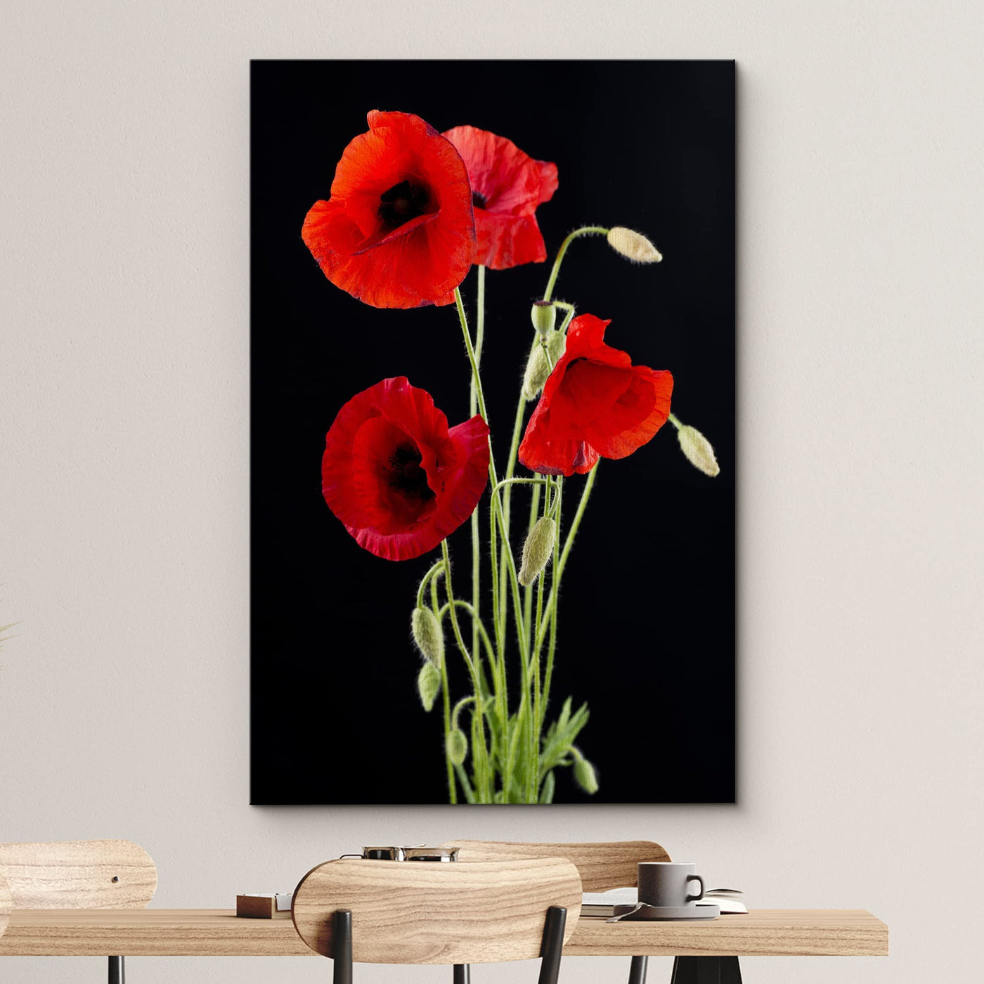 - Q: What is the style of this canvas print? A: The canvas print features a stunning design of red poppy flowers against a black background, making it a modern decor piece.