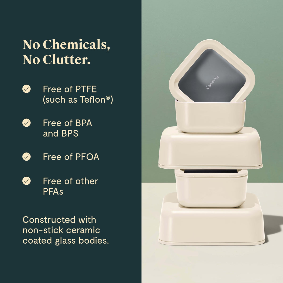 • Q: What materials are used in the Caraway food storage containers? A: The Caraway food storage containers are made from high-quality glass that is free of toxic materials such as PTFE, PFOA, PFAS, and BPA.