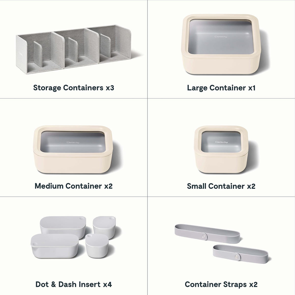 Caraway Glass Food Storage Set 14 Pieces - Ceramic Coated Food Containers - Easy to Store Non Toxic Lunch Box Containers with Glass Lids - Includes Storage Organizer & Dot & Dash Inserts - Cream