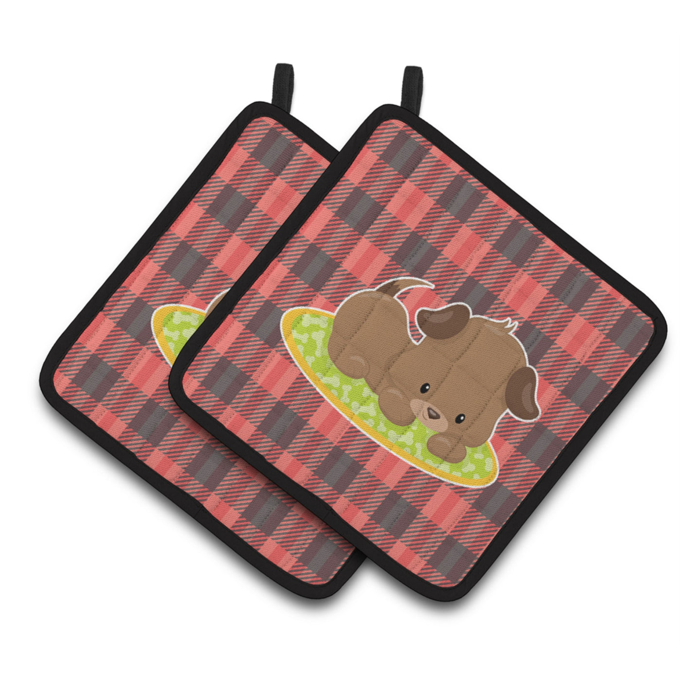 'Caroline's Treasures BB7072PTHD Puppy on Black Red Gingham Pair of Pot Holders 7.5 x 7.5'''' Multicolor''