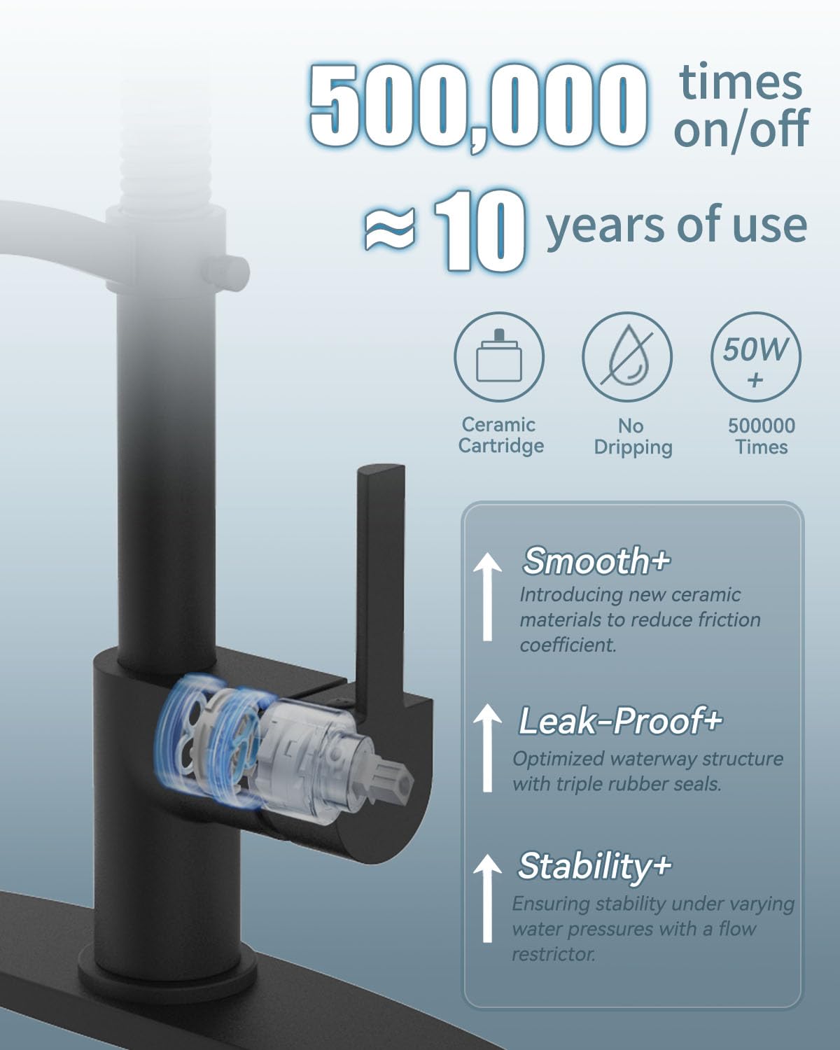 - Q: What materials are used in the construction of the faucet? A: The faucet has a lead-free solid brass body and a commercial-grade SUS 304 stainless steel spring construction for durability.