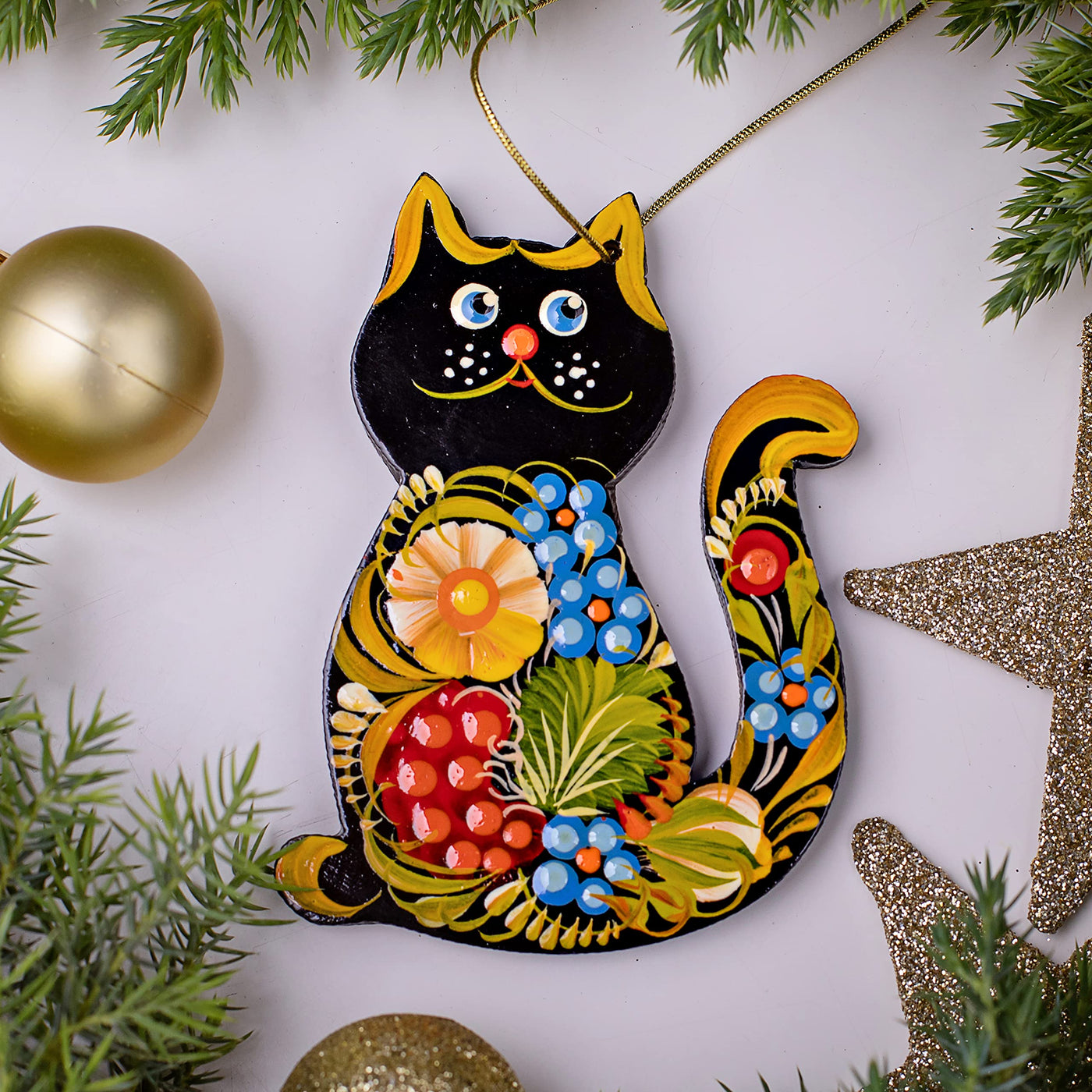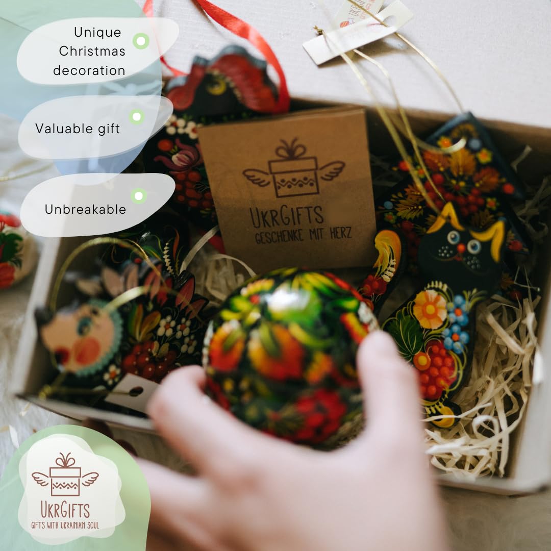Introducing our exquisite handmade wooden animal Christmas ornaments, painted in Ukraine in traditional Petrykivka style, which is Ukrainian handicrafts and UNESCO World Heritage. Ideal Christmas tree decoration and perfect gift. | Hand-painted on both sides | Material: wood | 3,3 ? 2,8 ? 0,2 Inch | 7 ? 8,5 ? 0,5 cm | Made in Ukraine | The actual drawings and colors may a little bit vary as each cat ornament is unique!
