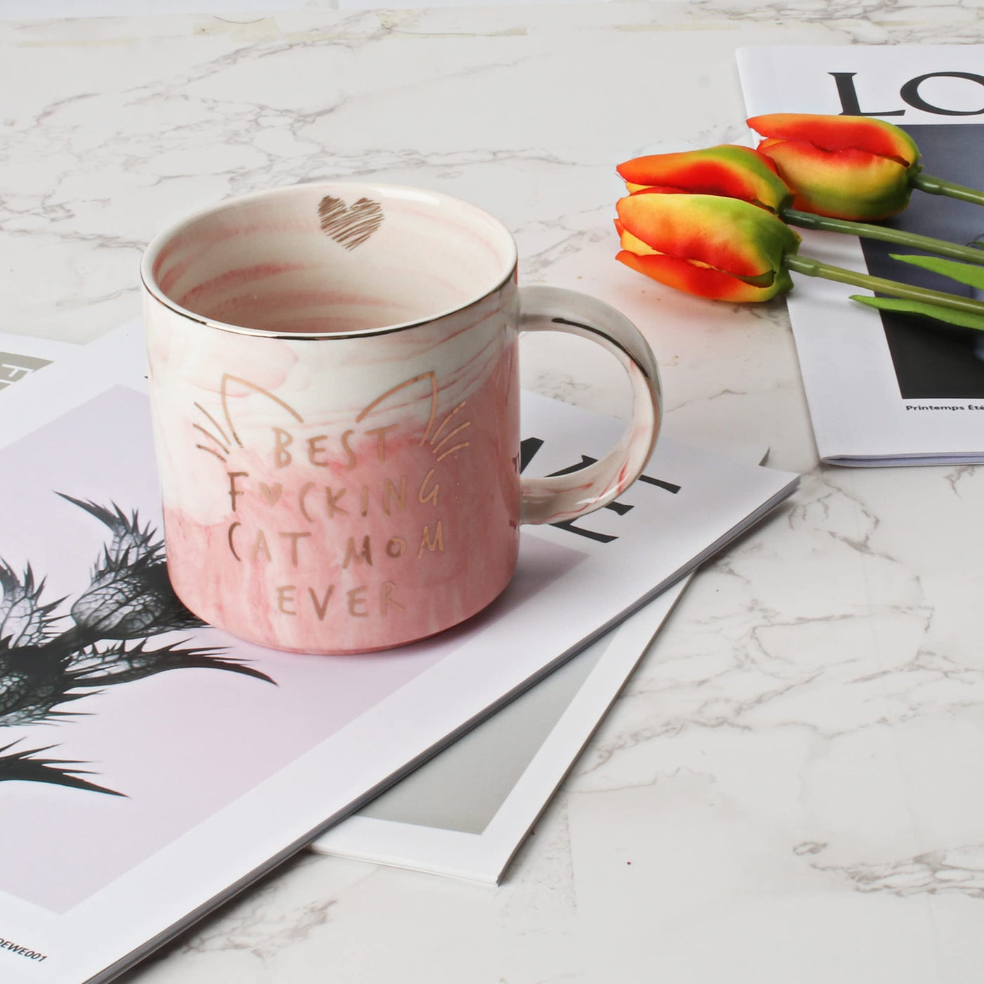 - Q: What design features does the Cat Mom Mug have? A: The mug features a beautiful pink marble pattern with gold accents and an elegant cat-themed saying that adds charm to your kitchen.