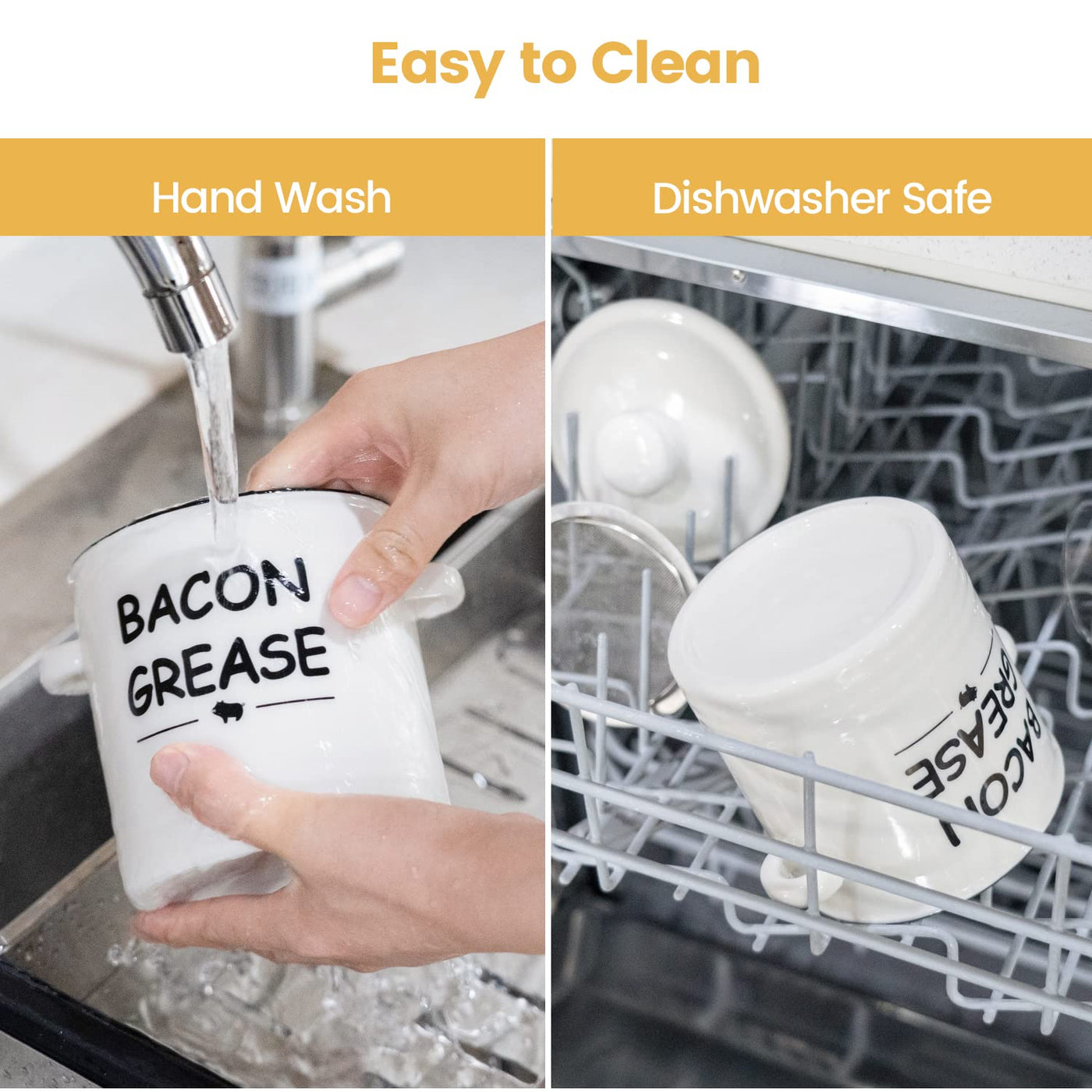 - Q: Is the bacon grease container easy to clean? A: Yes, both the ceramic container and the stainless-steel strainer are dishwasher safe, making them easy to clean.