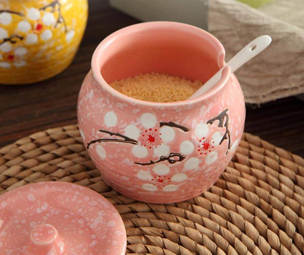 Ceramics Japanese Flower Sugar Bowl Seasoning Pot Salt Storage Jar With Lid Spoon