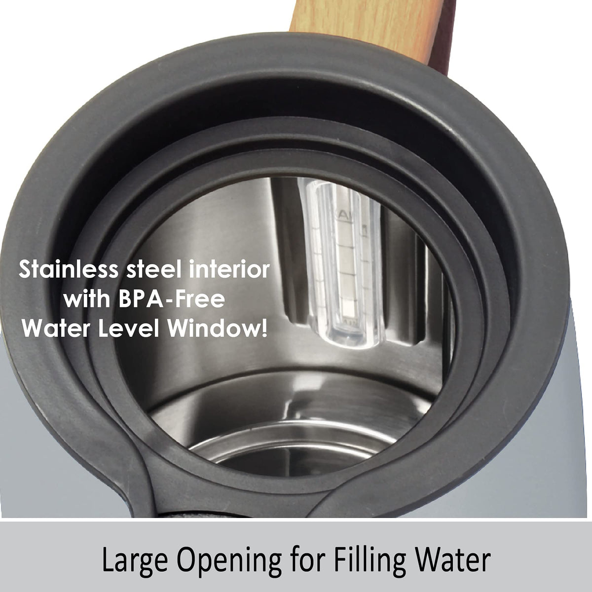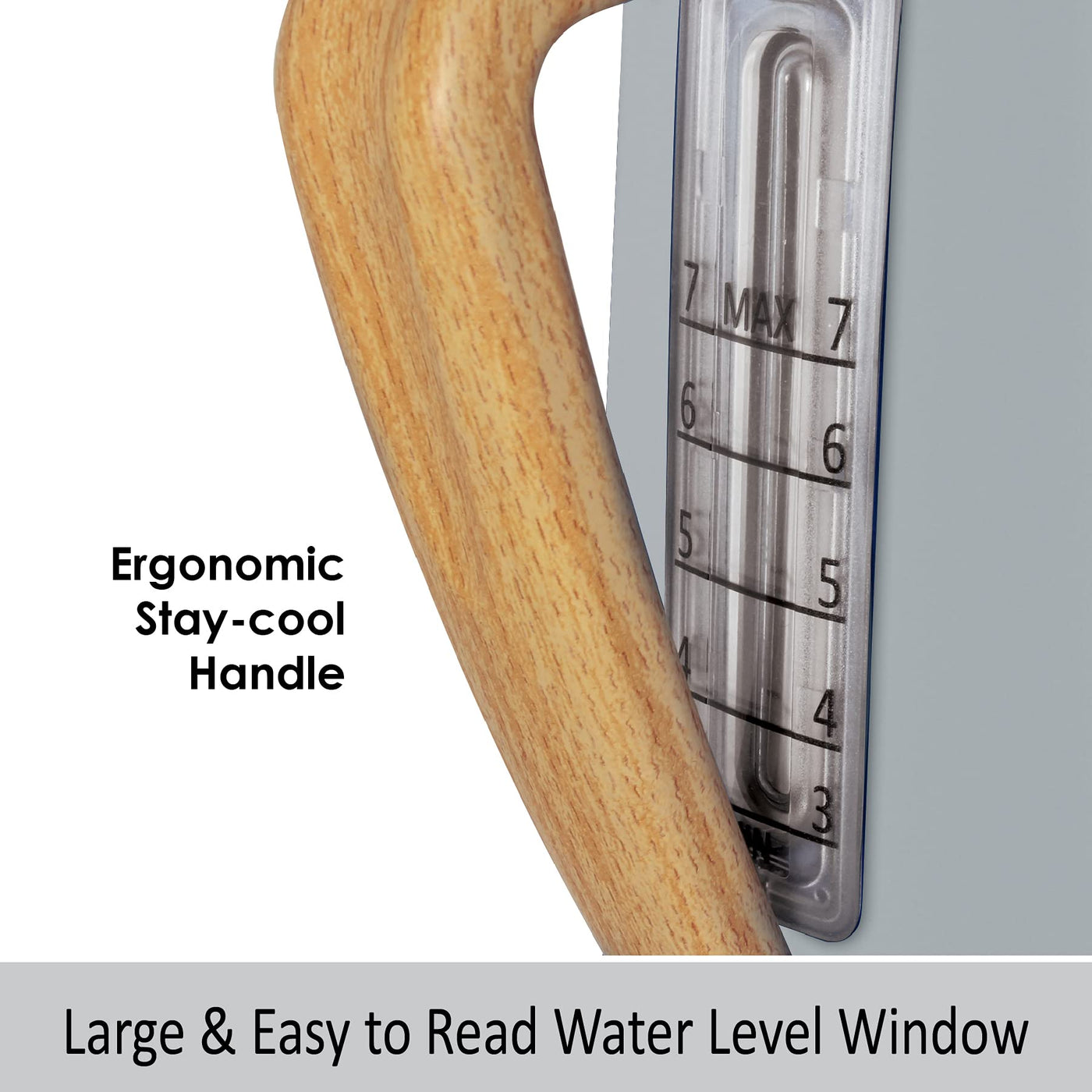 • Q: What design features does the kettle have? A: The kettle showcases Scandinavian styling with clean lines and an angled resin handle that mimics a blonde wood pattern.