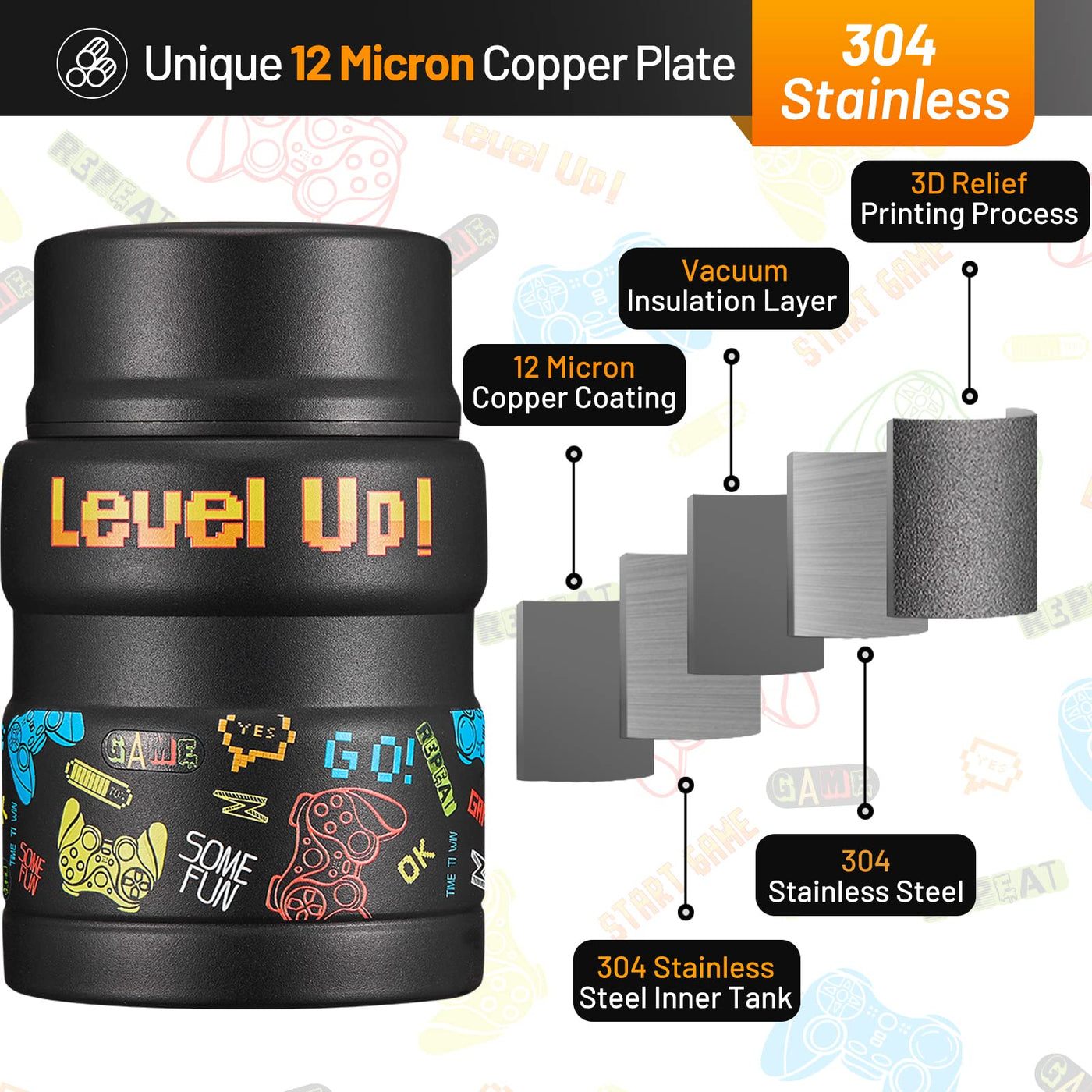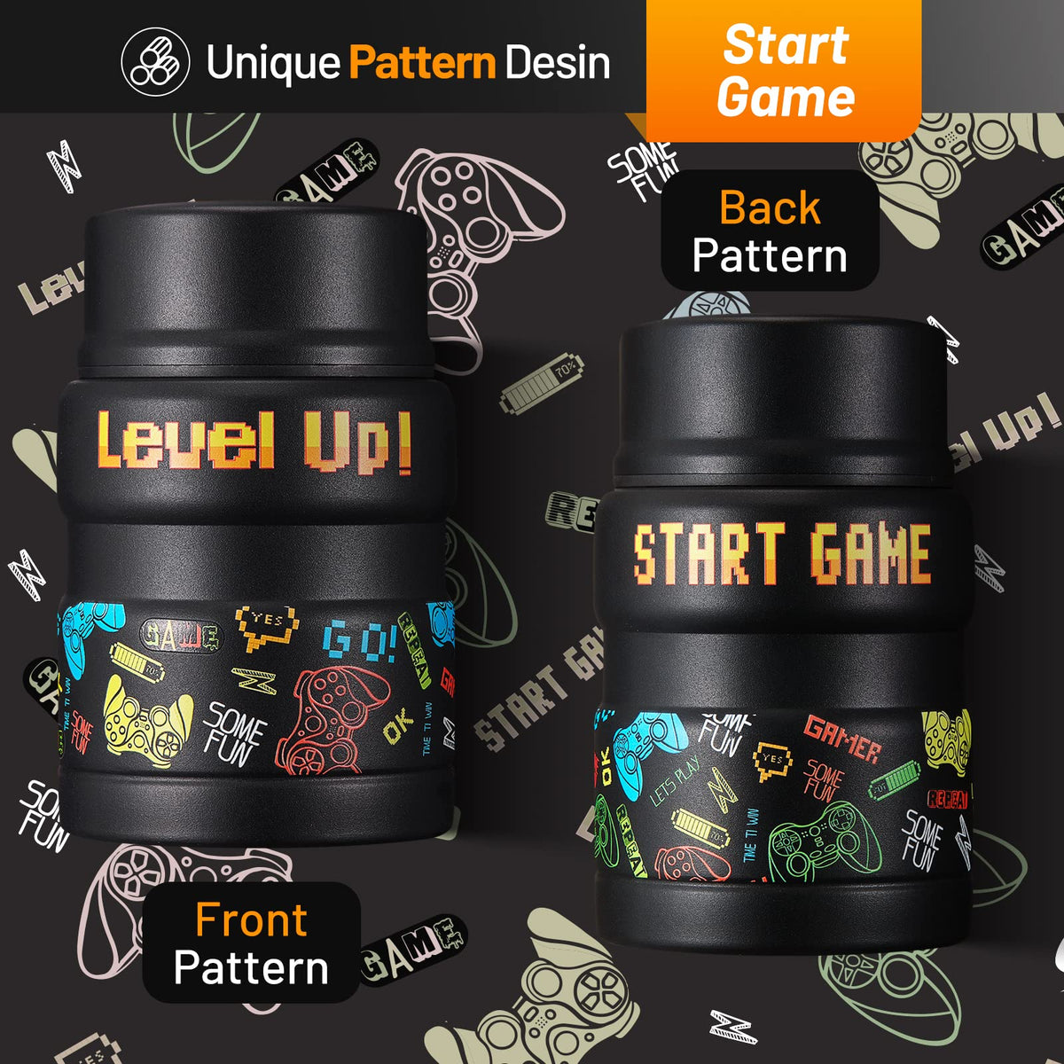 Charcy 17Oz Kids Thermo For Hot Food - Soup Thermo With Folding Spoon - Insulated Food Jar For Hot & Cold Food - Black Game