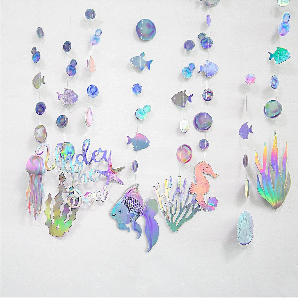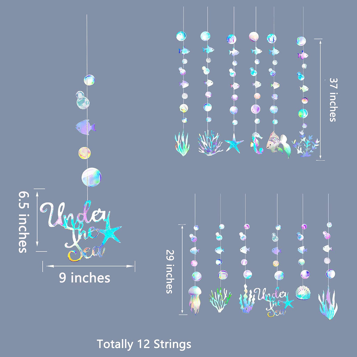 - Q: How many strands of garland are included in the set? A: The set includes 12 strands of under the sea garland featuring holographic jellyfish, coral, fish, and seahorses.