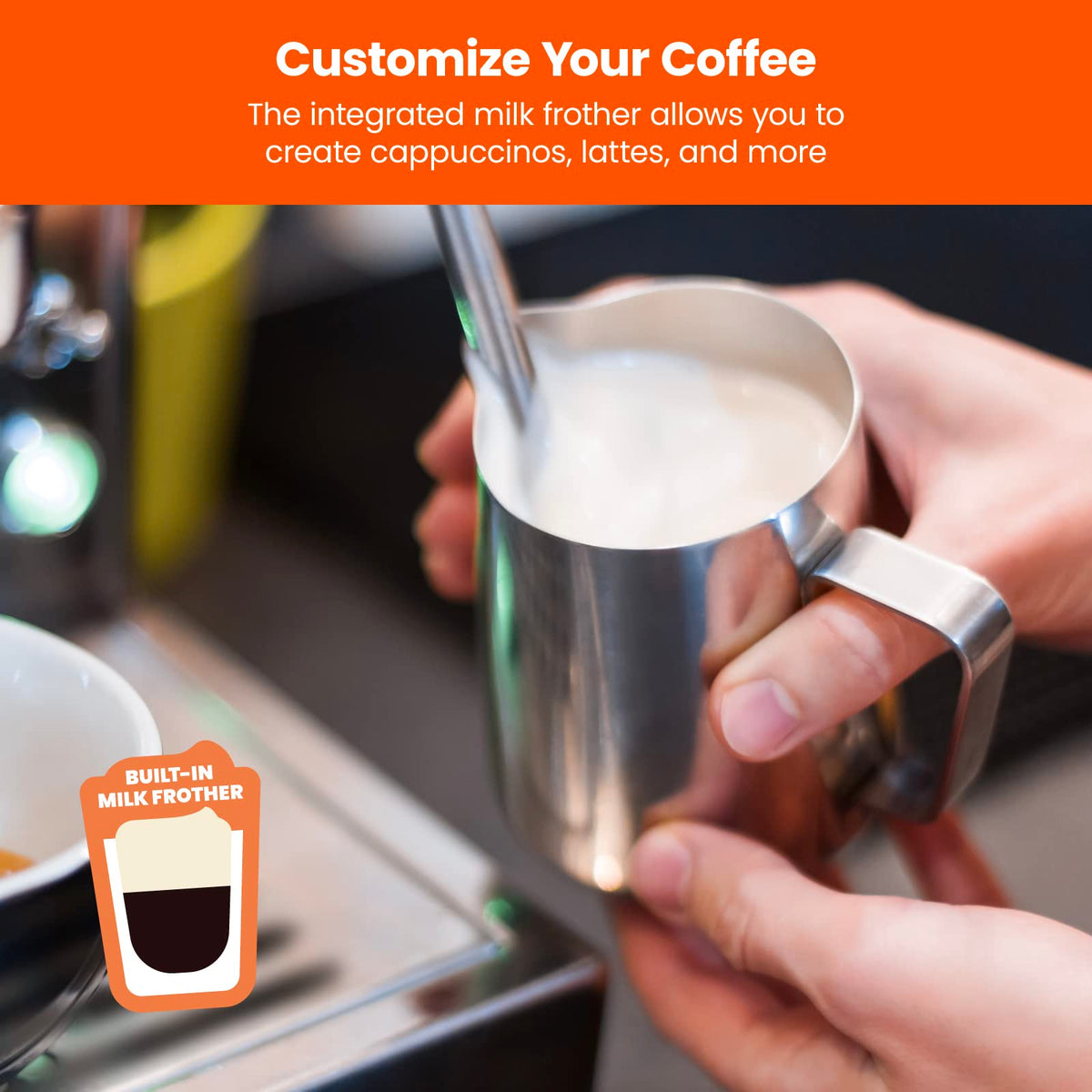 - Q: How do I froth milk using the integrated frother? A: To froth milk, simply fill the frother with milk, turn it on, and wait for the foam to form. It's designed for easy operation to create creamy lattes and cappuccinos.
