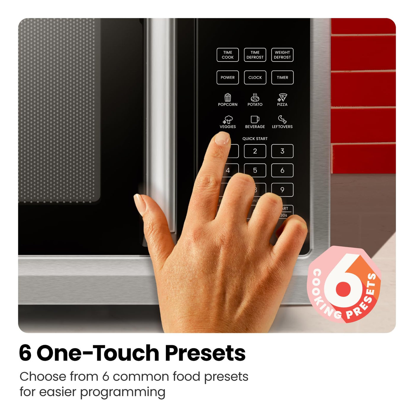 • Q: What cooking presets does this microwave offer? A: The microwave features six cooking presets for popcorn, potato, pizza, veggies, beverages, and leftovers.