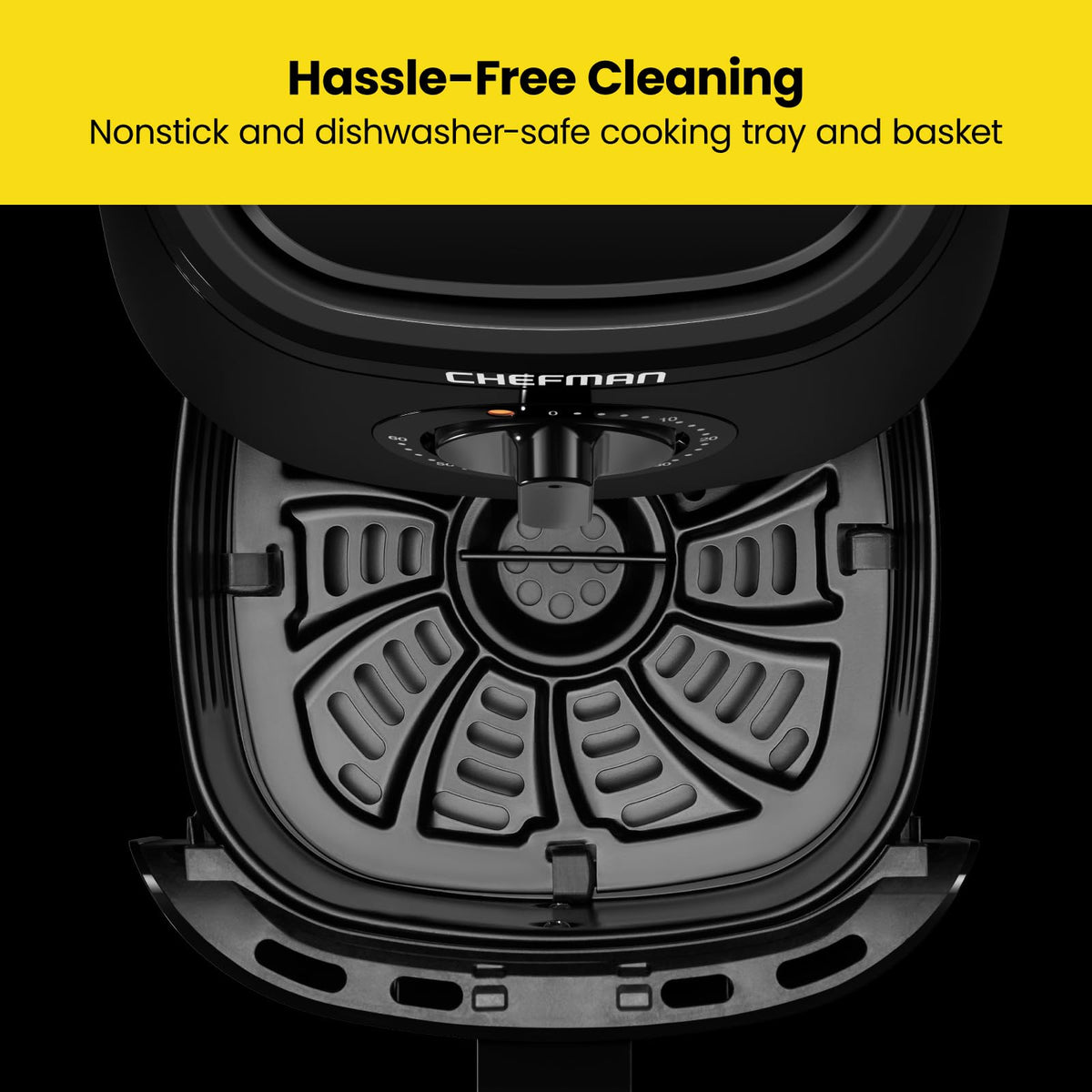 - Q: Is the basket and tray of the Chefman TurboFry Air Fryer dishwasher safe? A: Yes, both the frying basket and tray are dishwasher safe, making cleanup easy and convenient after cooking.