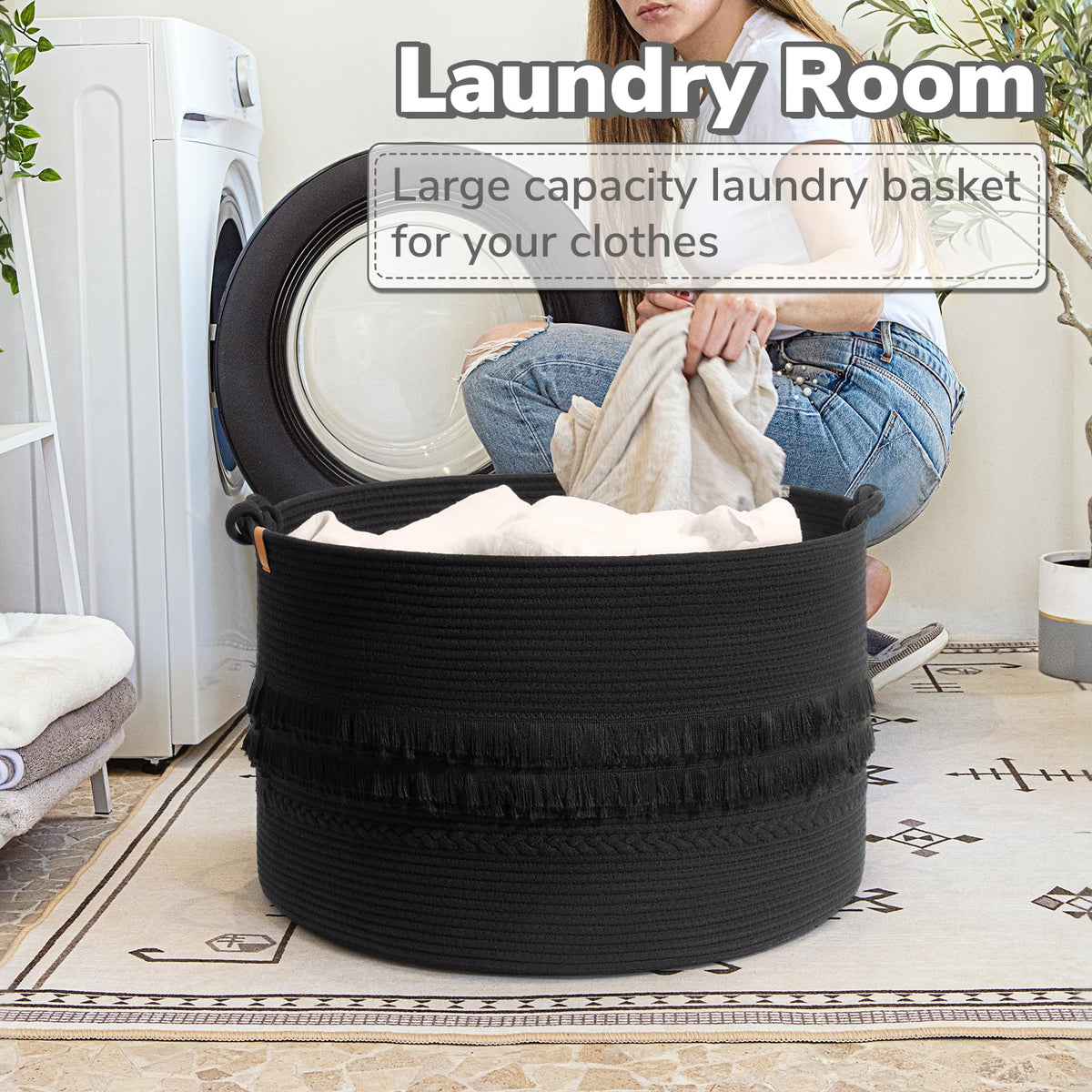 Cherrynow Extra Large Black Laundry Basket, Rope Storage Basket For Bathroom, Bedroom, Living Room, Entryway, Big Blanket Basket