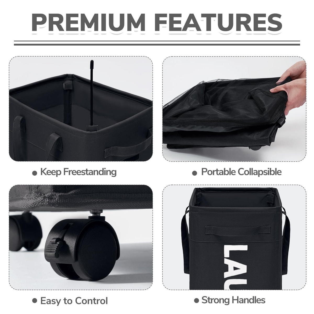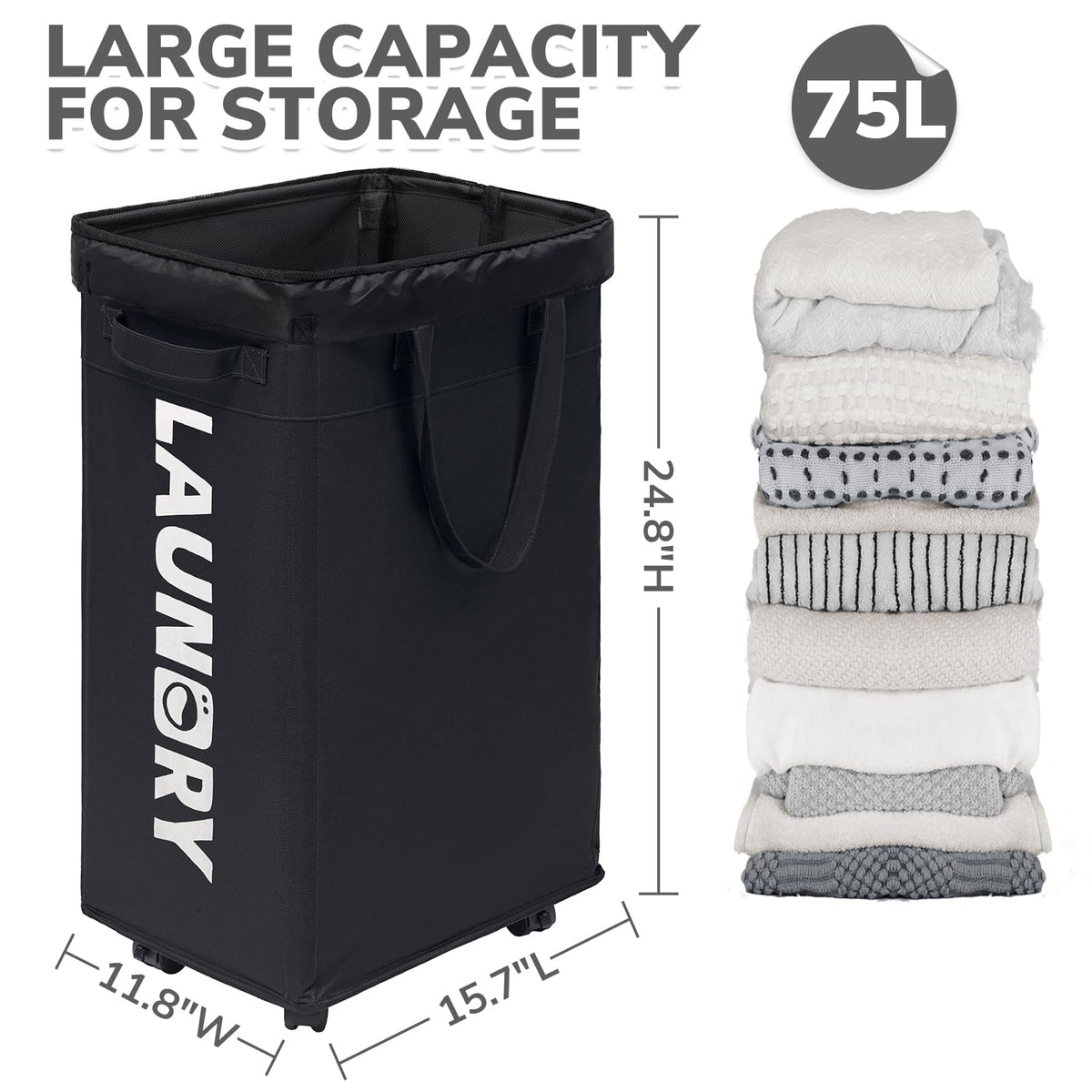 Chicvita 75L Slim Laundry Hamper With Wheels And Removable Wash Bag, Black Rolling Basket With Handle For Laundry Room